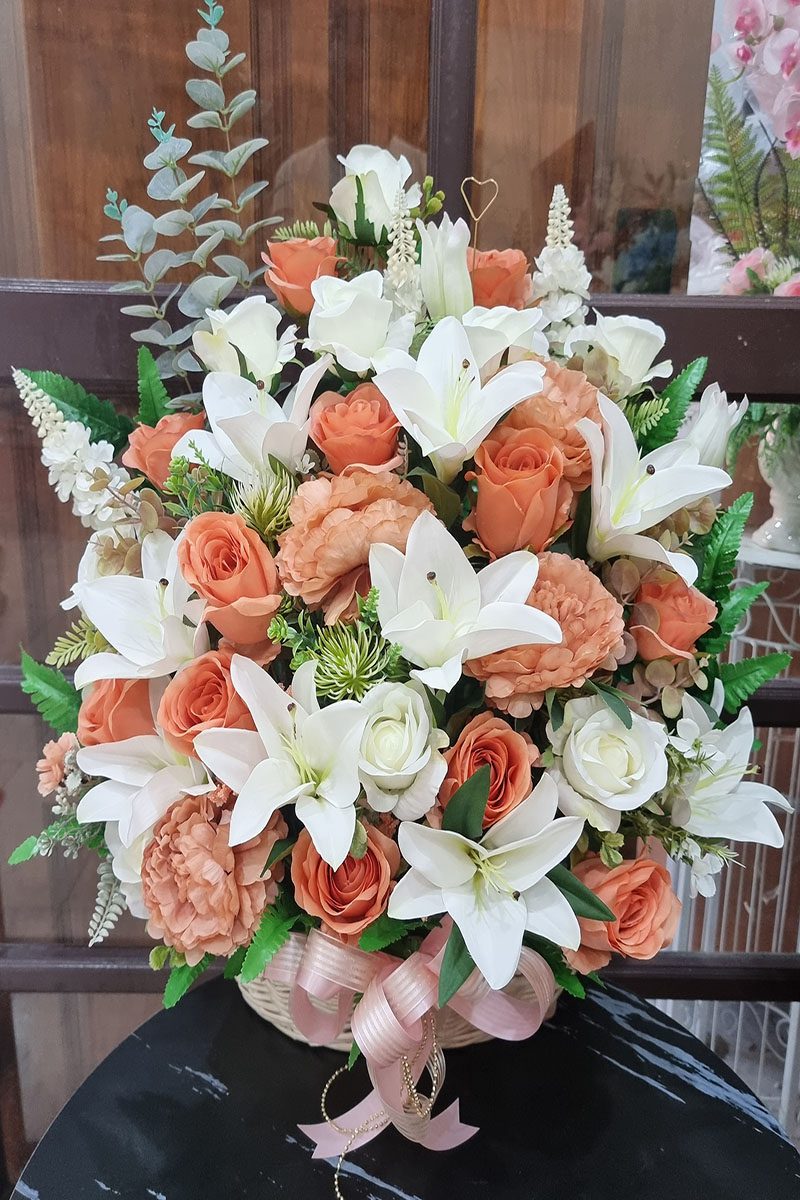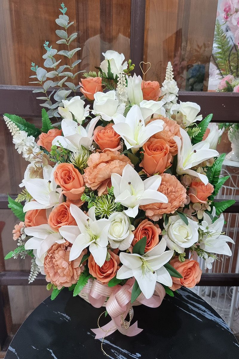 กระเช้าดอกไม้ประดิษฐ์สีส้ม-AB1001