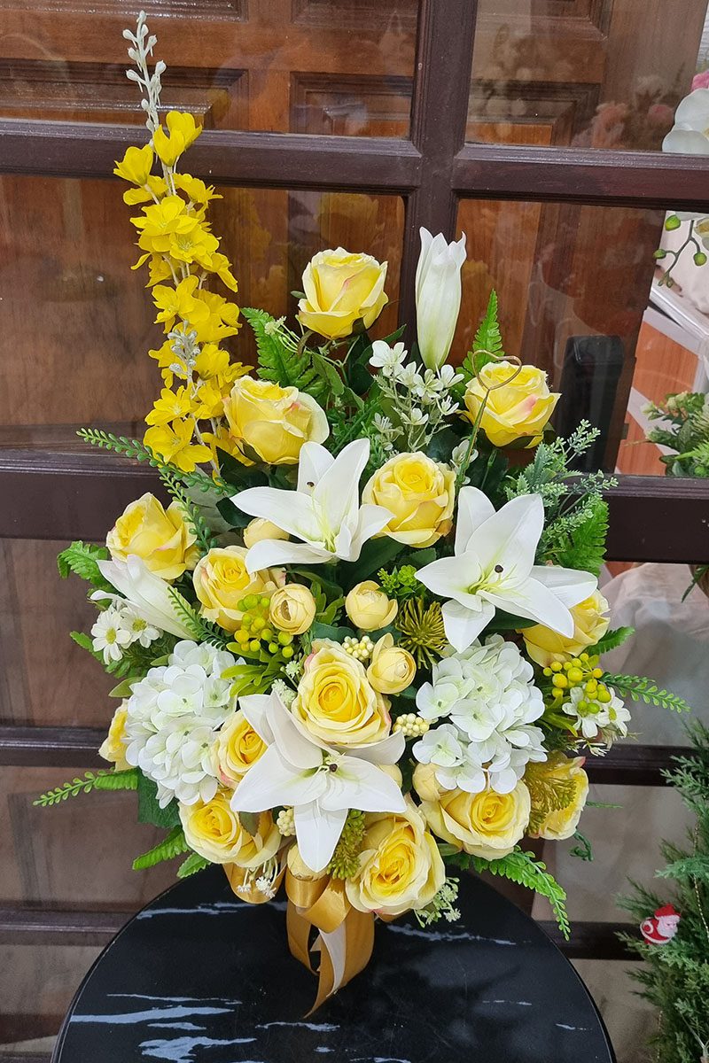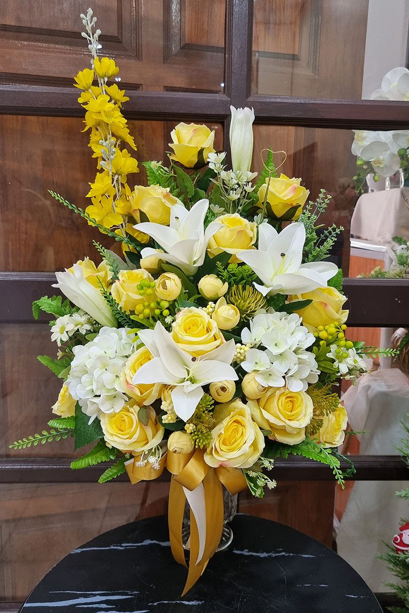 แจกันดอกไม้ประดิษฐ์  สีเหลือง   ประกอบไปด้วยดอกไม้ หลักคือ
