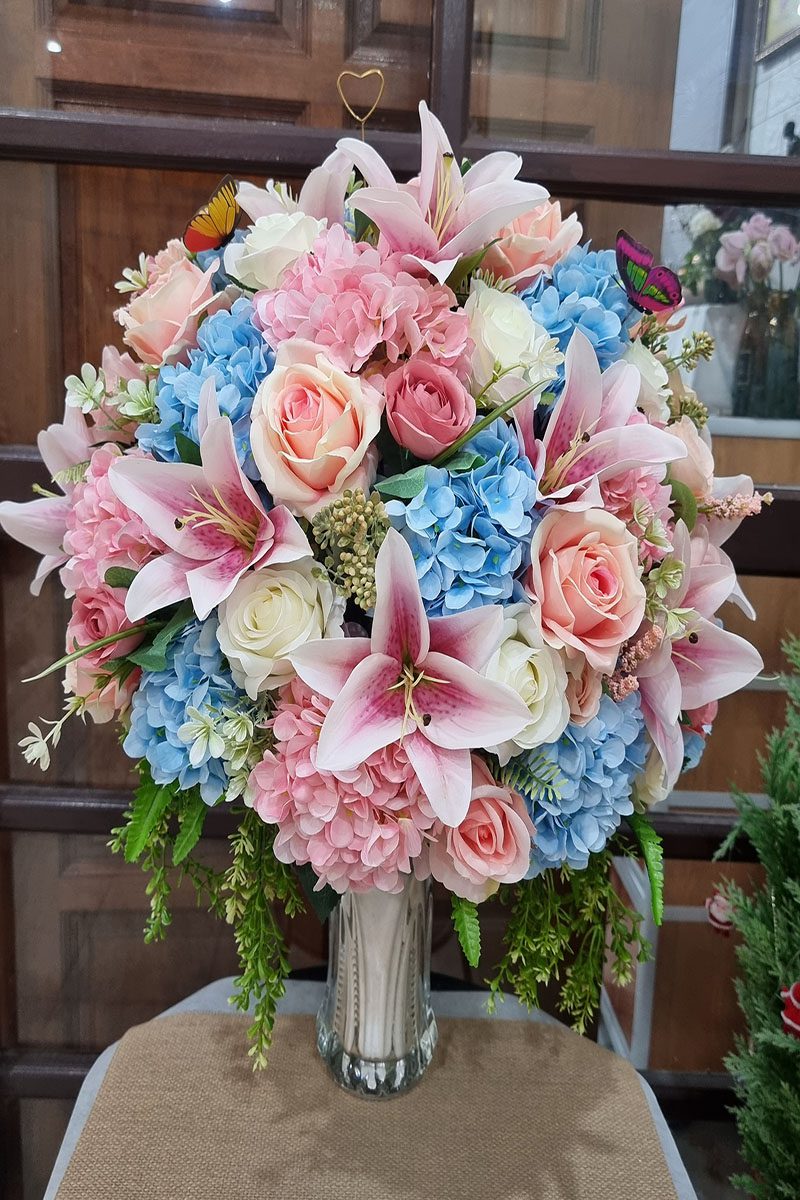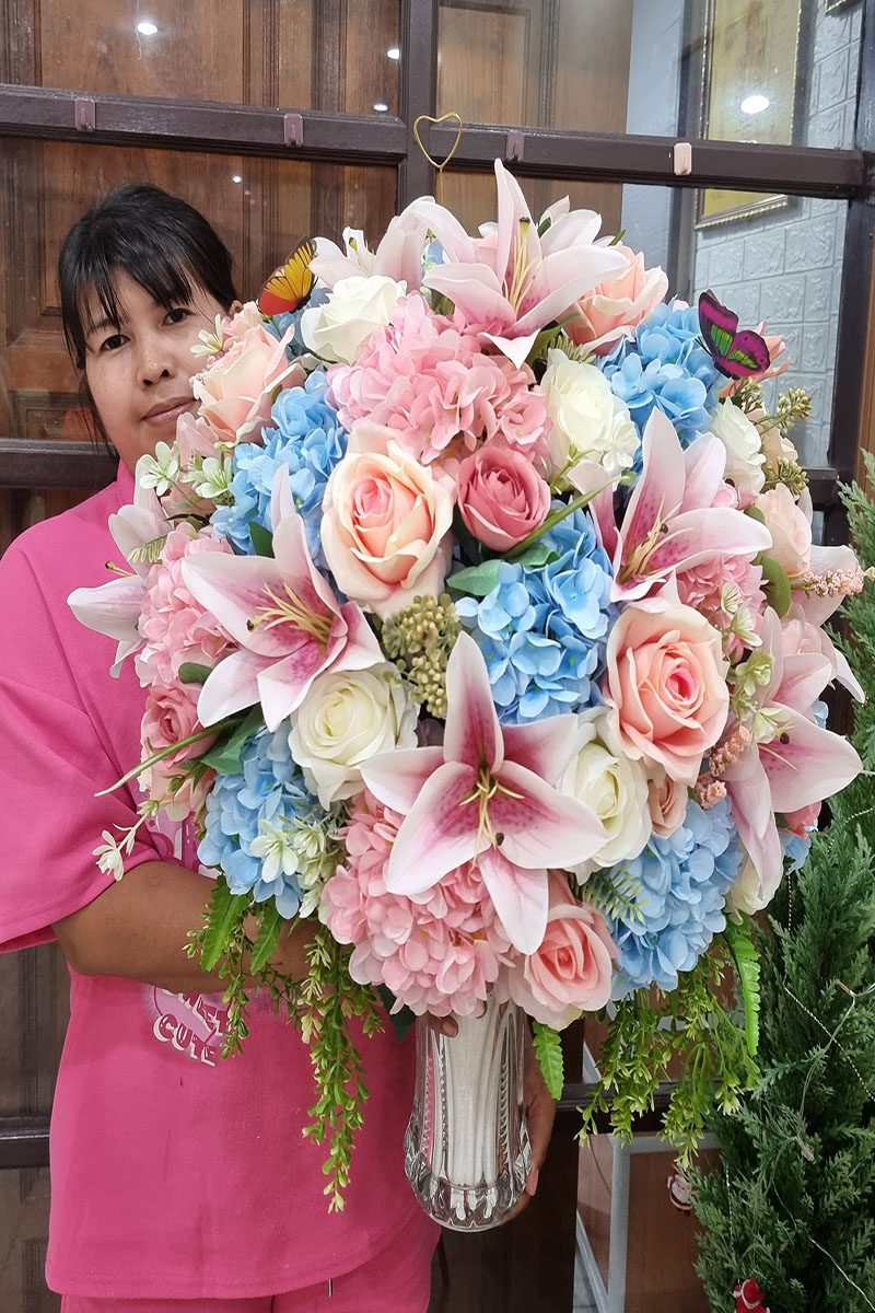 แจกันดอกไม้ประดิษฐ์  สีชมพูฟ้า   ประกอบไปด้วยดอกไม้ หลักคือ