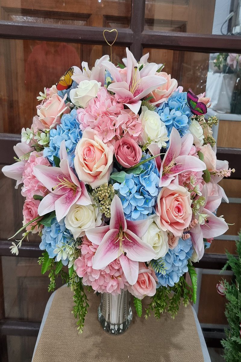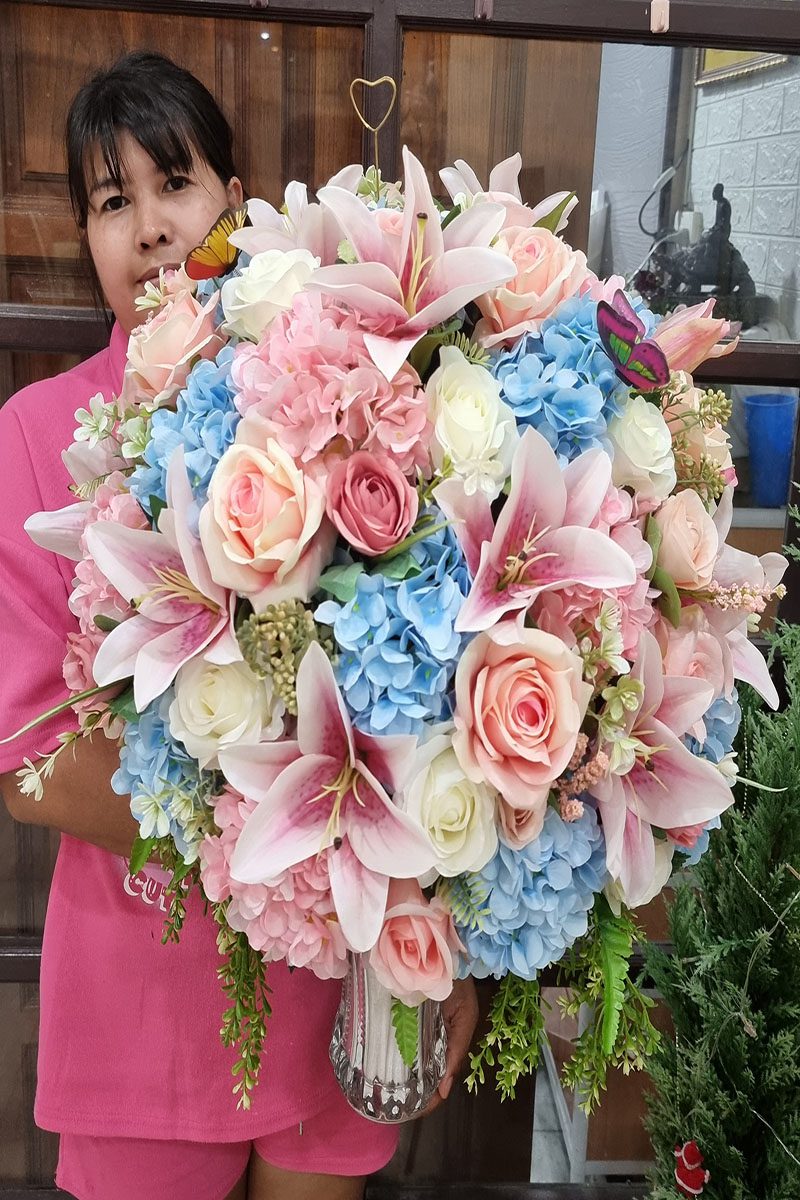 ดอกไม้ประดิษฐ์ โทนสีชมพู ฟ้า ใบใหญ่ทรงกลม