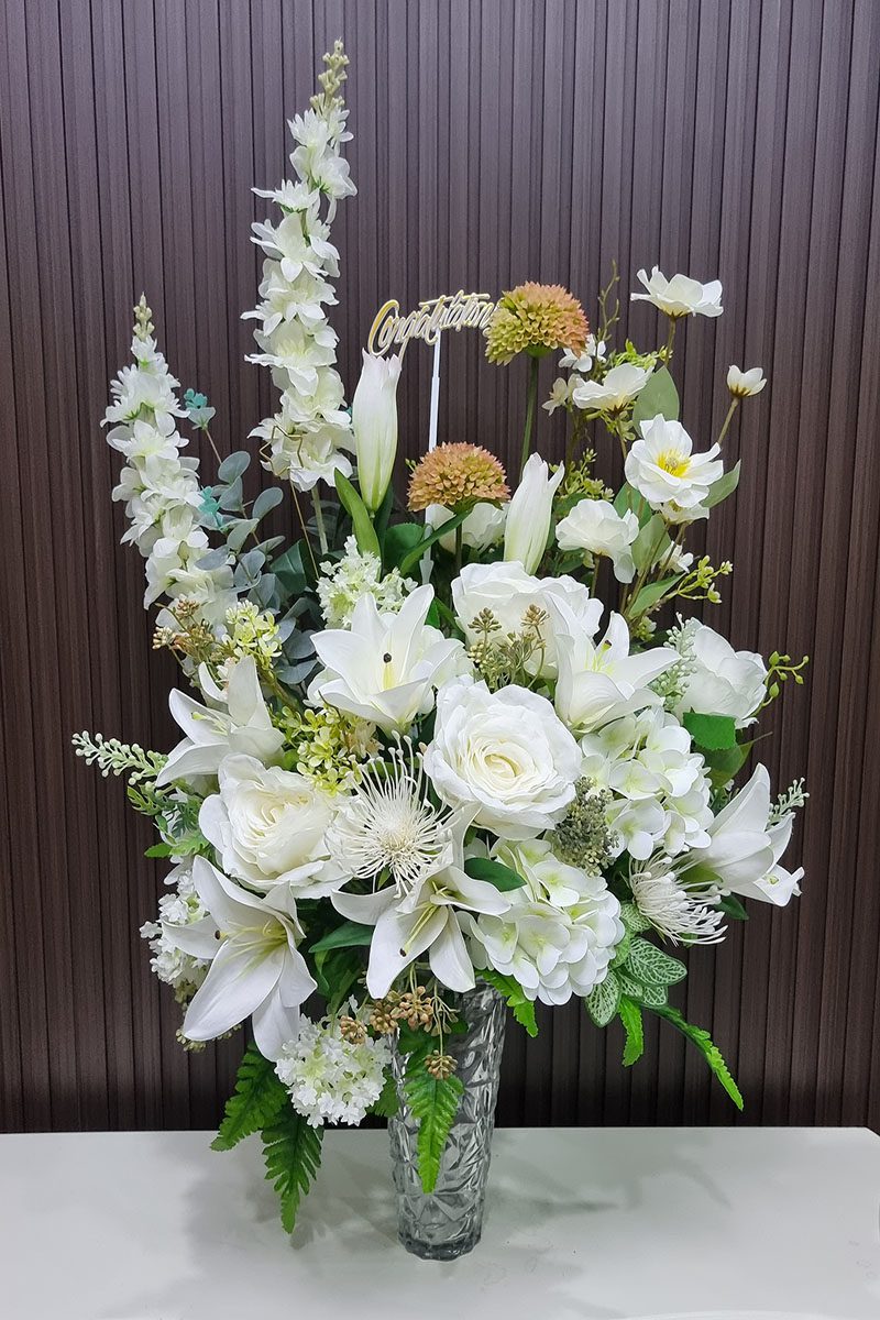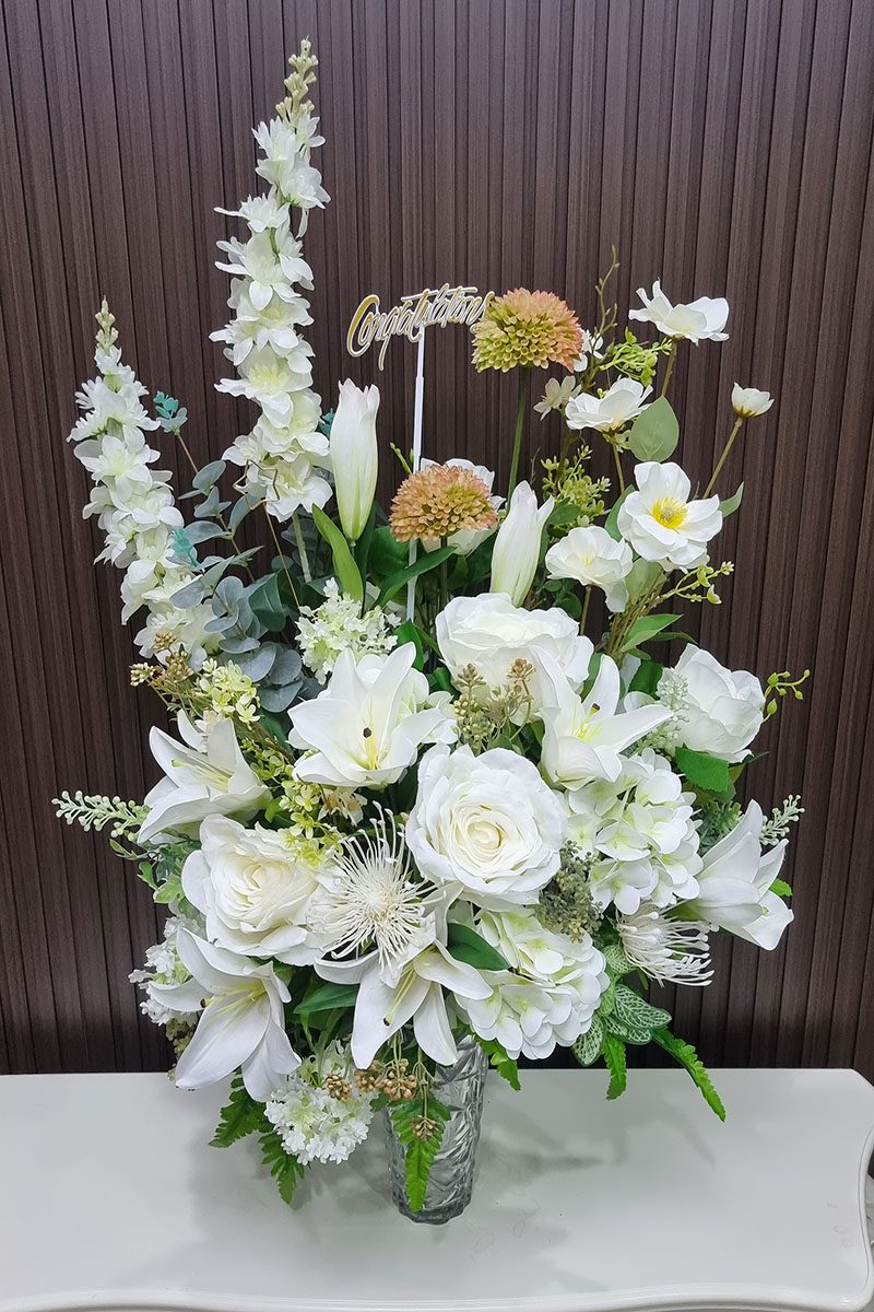 แจกันดอกไม้ประดิษฐ์  สีขาว   ประกอบไปด้วยดอกไม้ หลักคือ