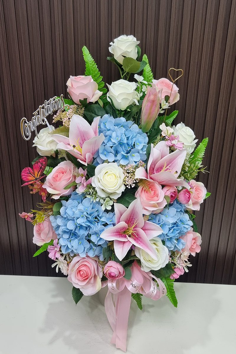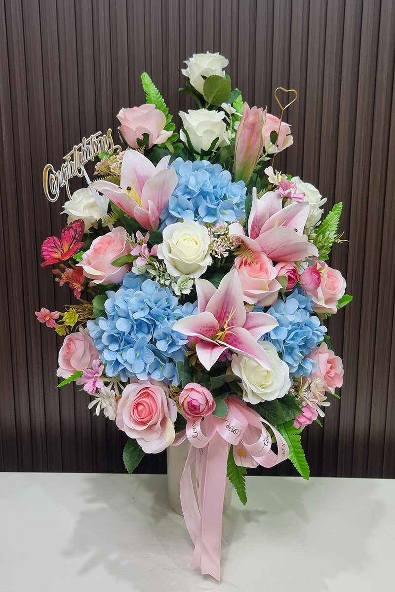 แจกันดอกไม้ประดิษฐ์  สีชมพูฟ้า  ประกอบไปด้วยดอกไม้ หลักคือ