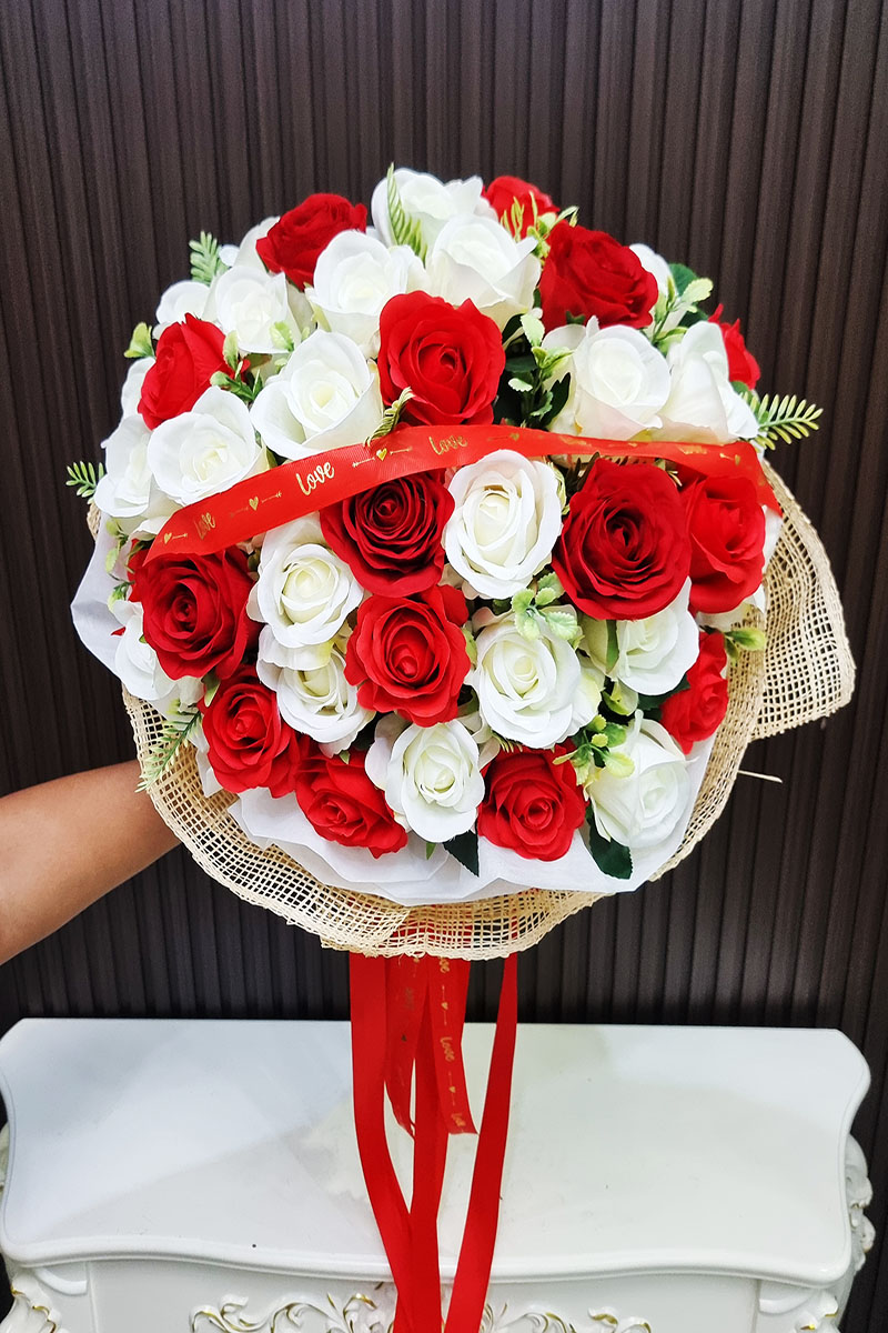 ดอกไม้สวยเหมือนดอกจริง จัดช่อห่อกระดาษสีขาว ตัดสีน้ำตาล โบว์สีแดง