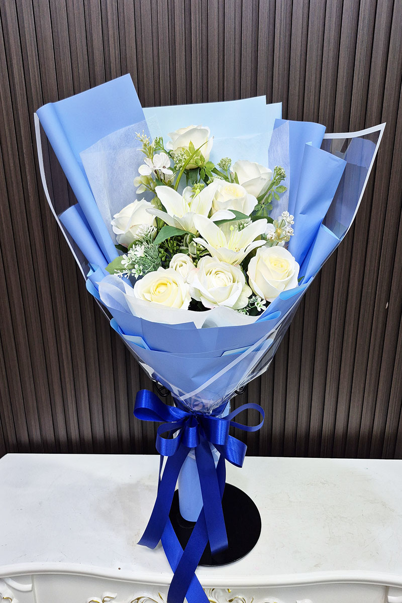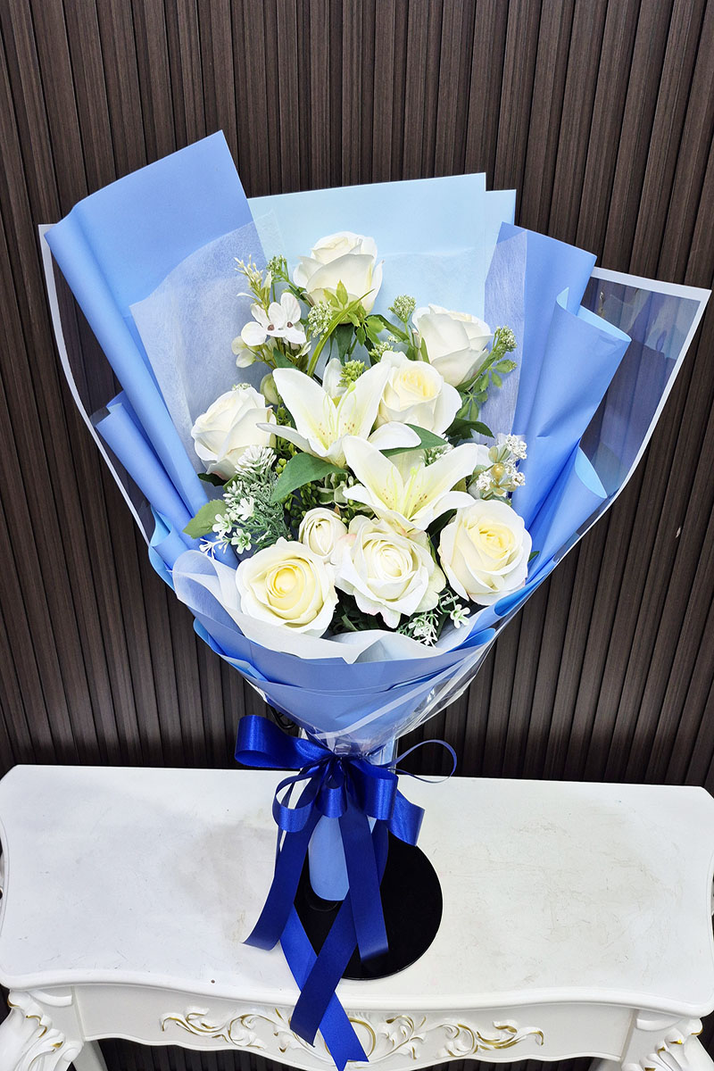 ดอกไม้สวยเหมือนดอกจริง จัดช่อห่อกระดาษสีขาว ตัดสีฟ้า โบว์สีน้ำเงิน