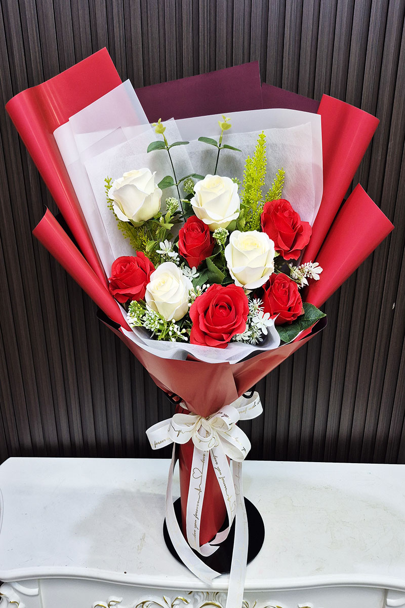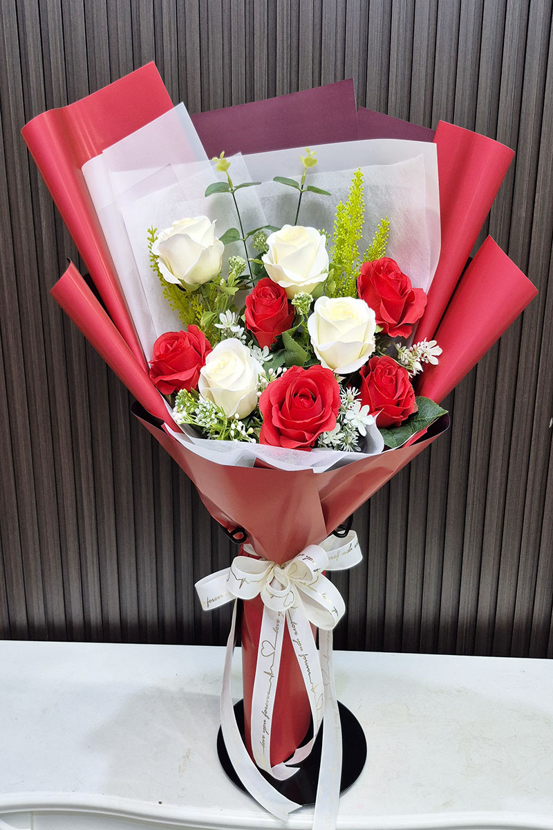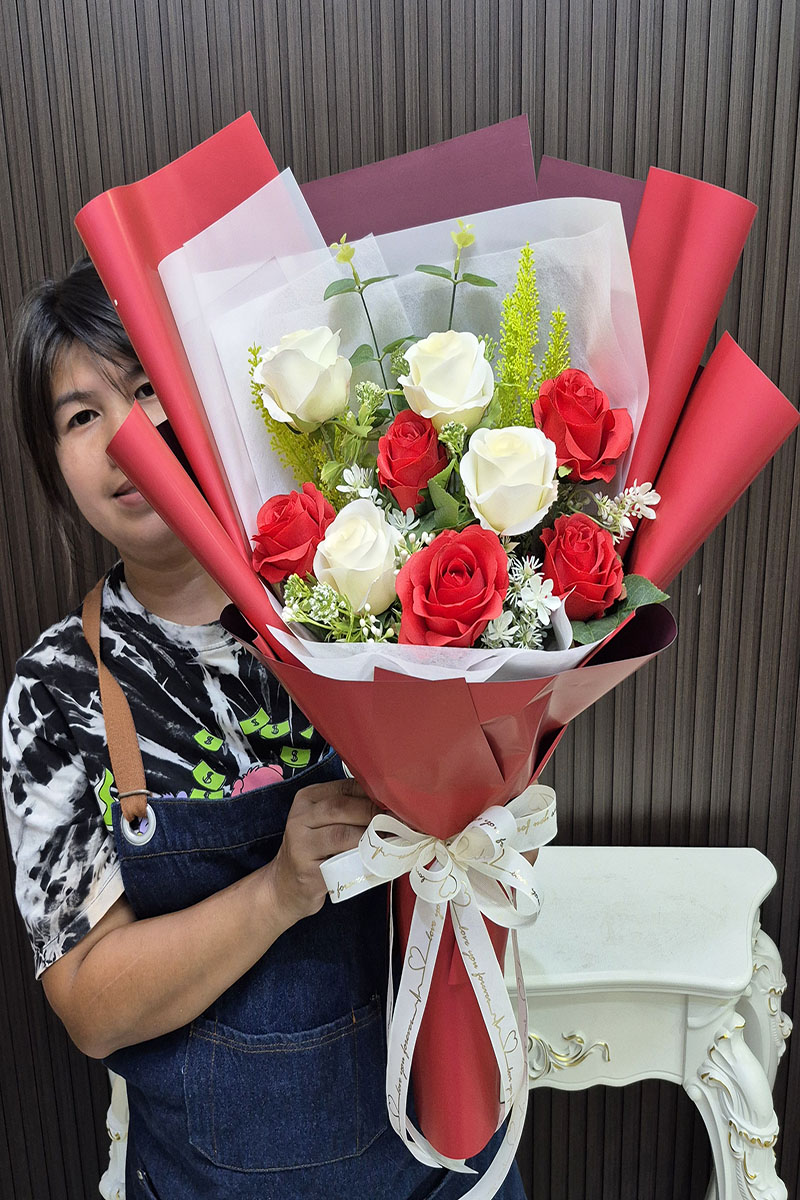 ดอกไม้สวยเหมือนดอกจริง จัดช่อห่อกระดาษสีขาว ตัดสีน้ำตาล โบว์สีแดง