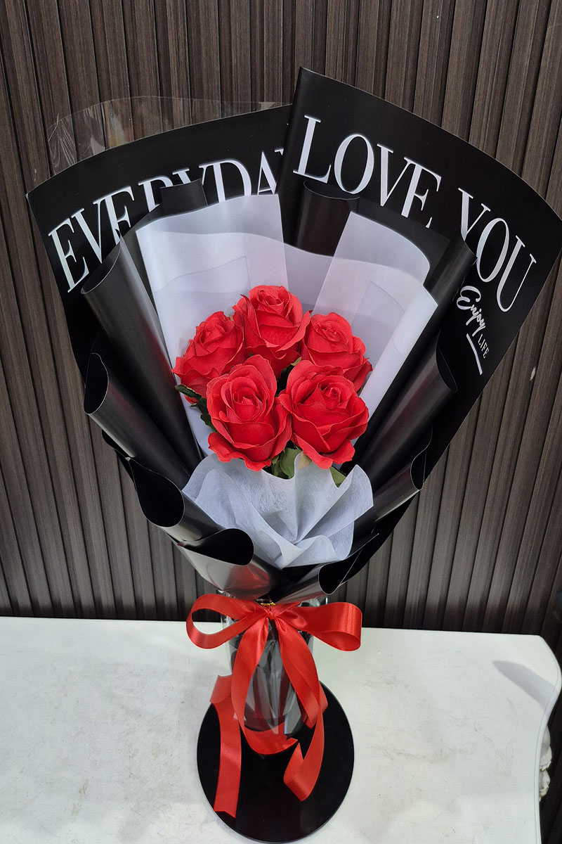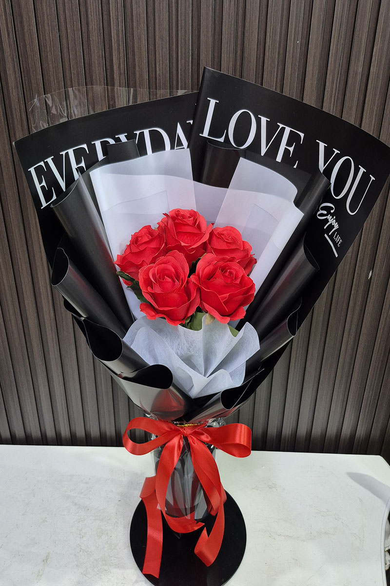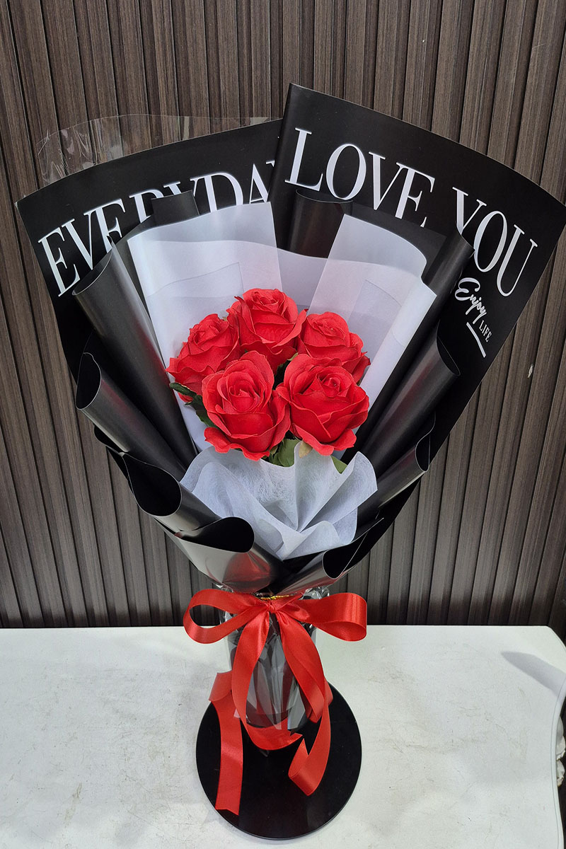 ดอกไม้ประดิษฐ์ จัดช่อดอกกุหลาบ ดอกกุหลาบแดง  5 ดอก