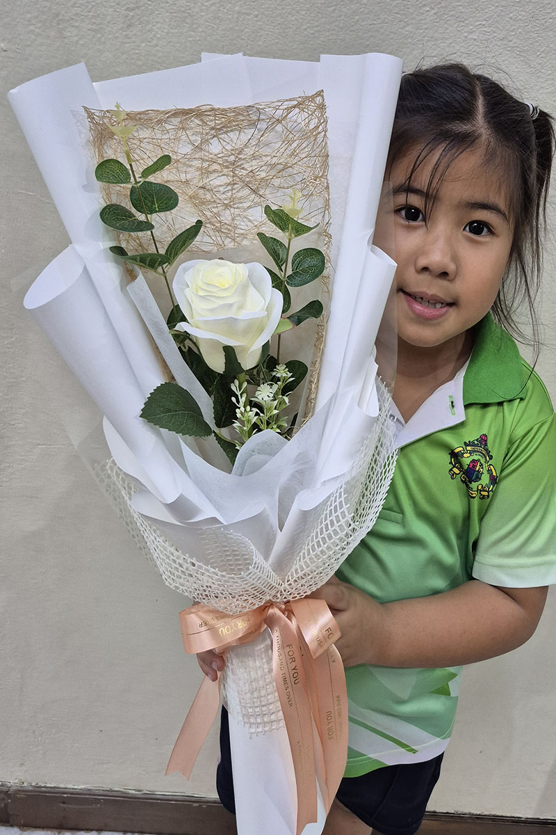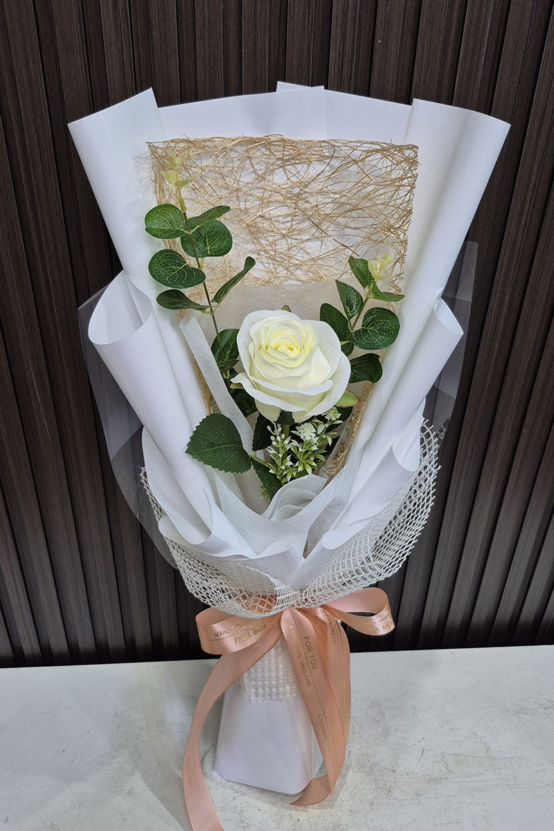 ดอกไม้สวยเหมือนดอกจริง จัดช่อห่อกระดาษสีขาว ตัดสีน้ำตาล โบว์สีแดง