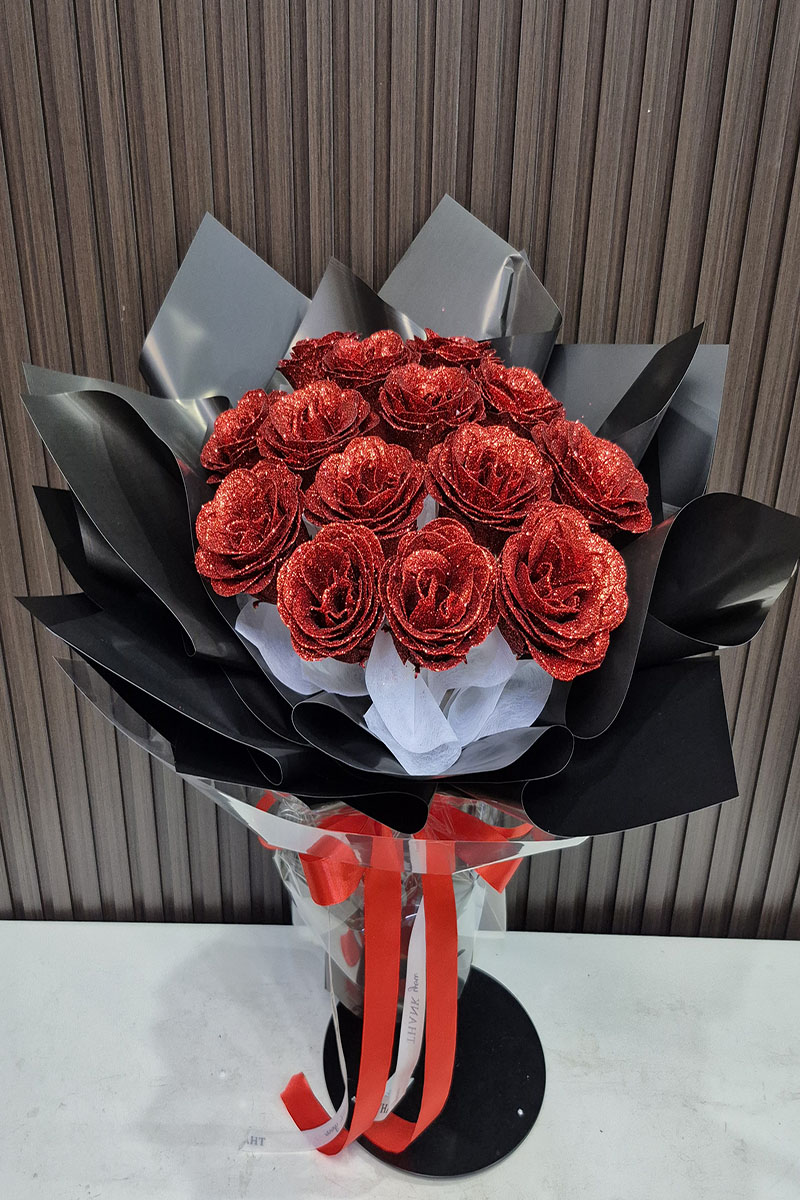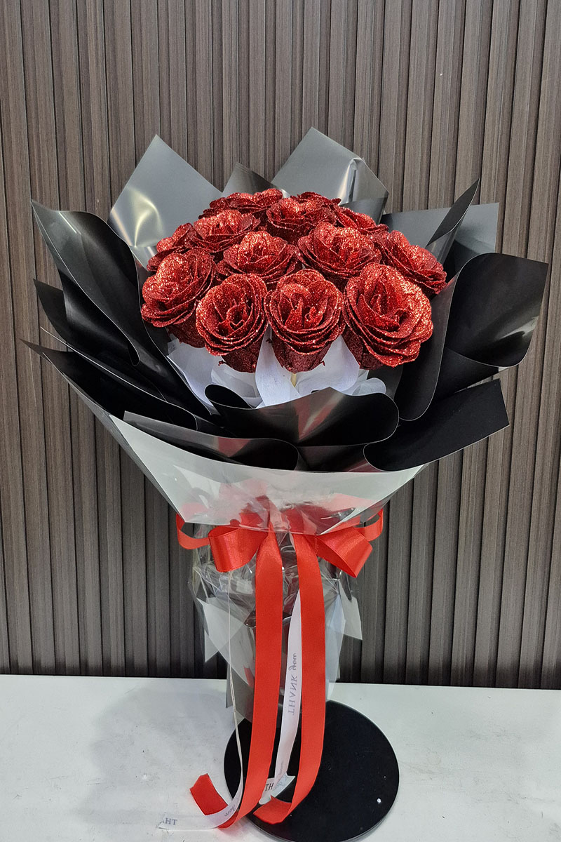 ดอกไม้สวยเหมือนดอกจริง จัดช่อห่อกระดาษสีขาว ตัดสีดำ โบว์สีแดง