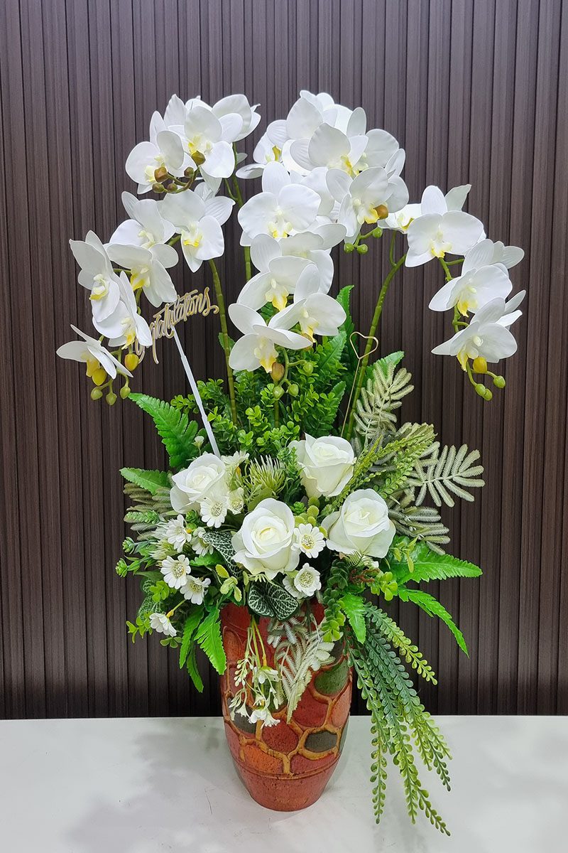 แจกันดอกไม้ประดิษฐ์  ดอกกล้วยไม้สีขาว   ประกอบไปด้วยดอกไม้ หลักคือ