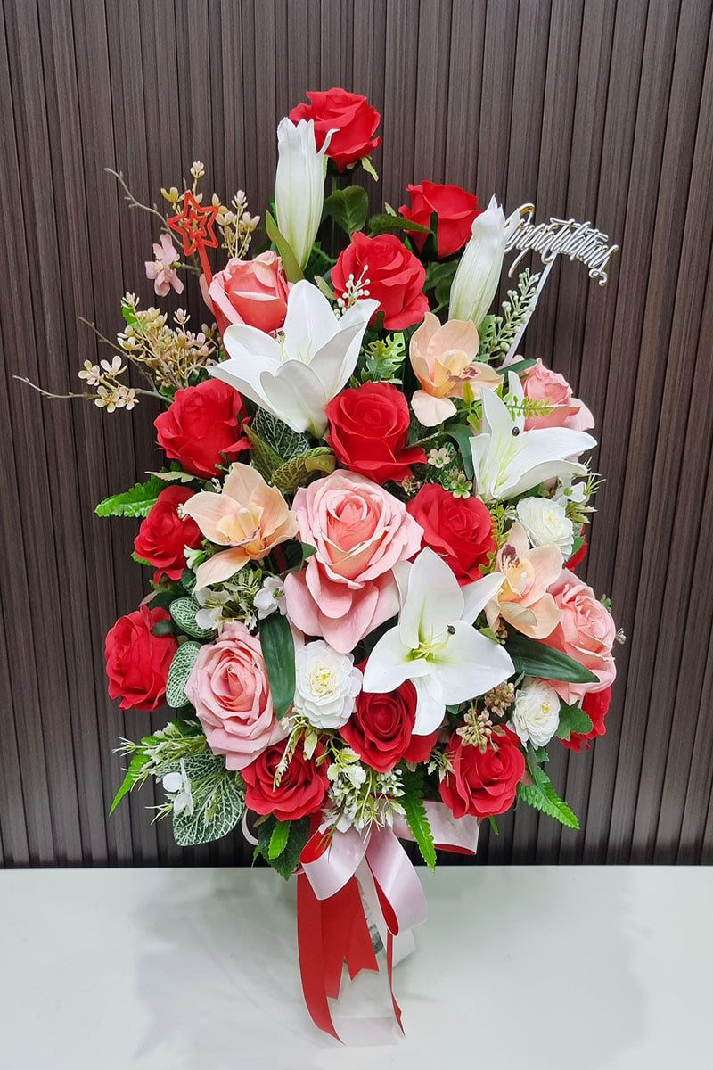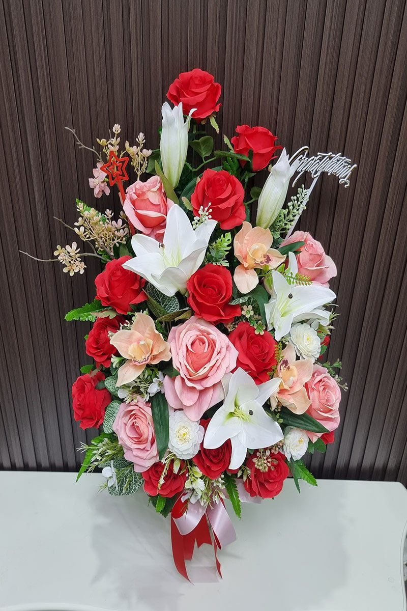 ดอกไม้ประดิษฐ์ จัดโทนสีสดใส แดง ชมพู