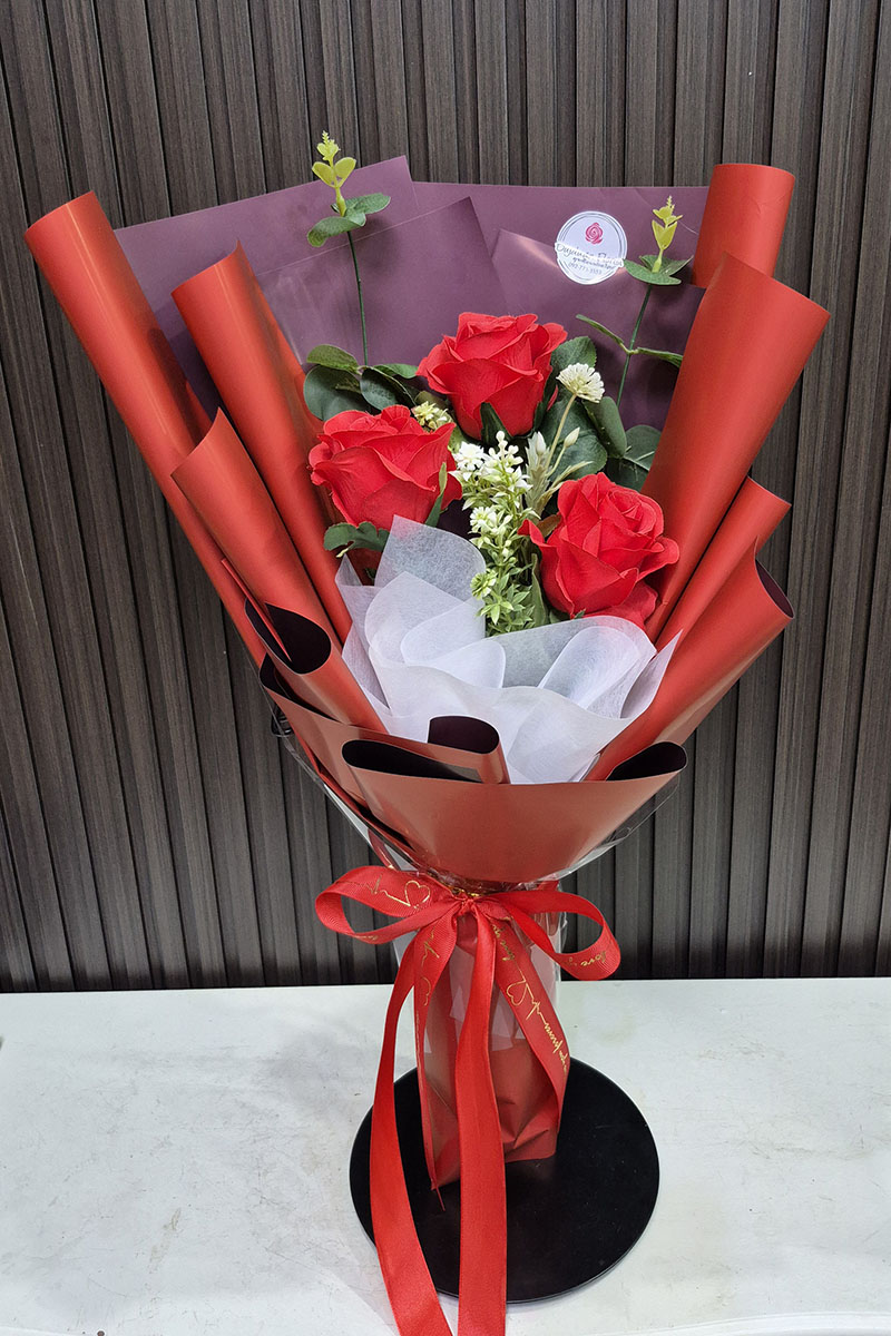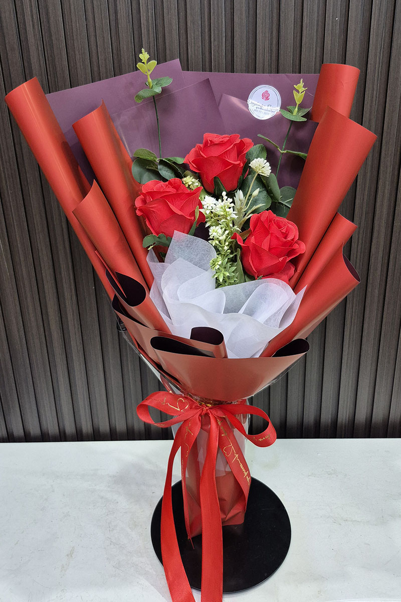 ดอกไม้ประดิษฐ์ จัดช่อดอกกุหลาบ ดอกกุหลาบแดง  3 ดอก