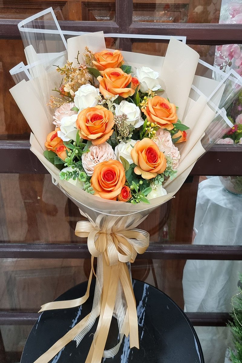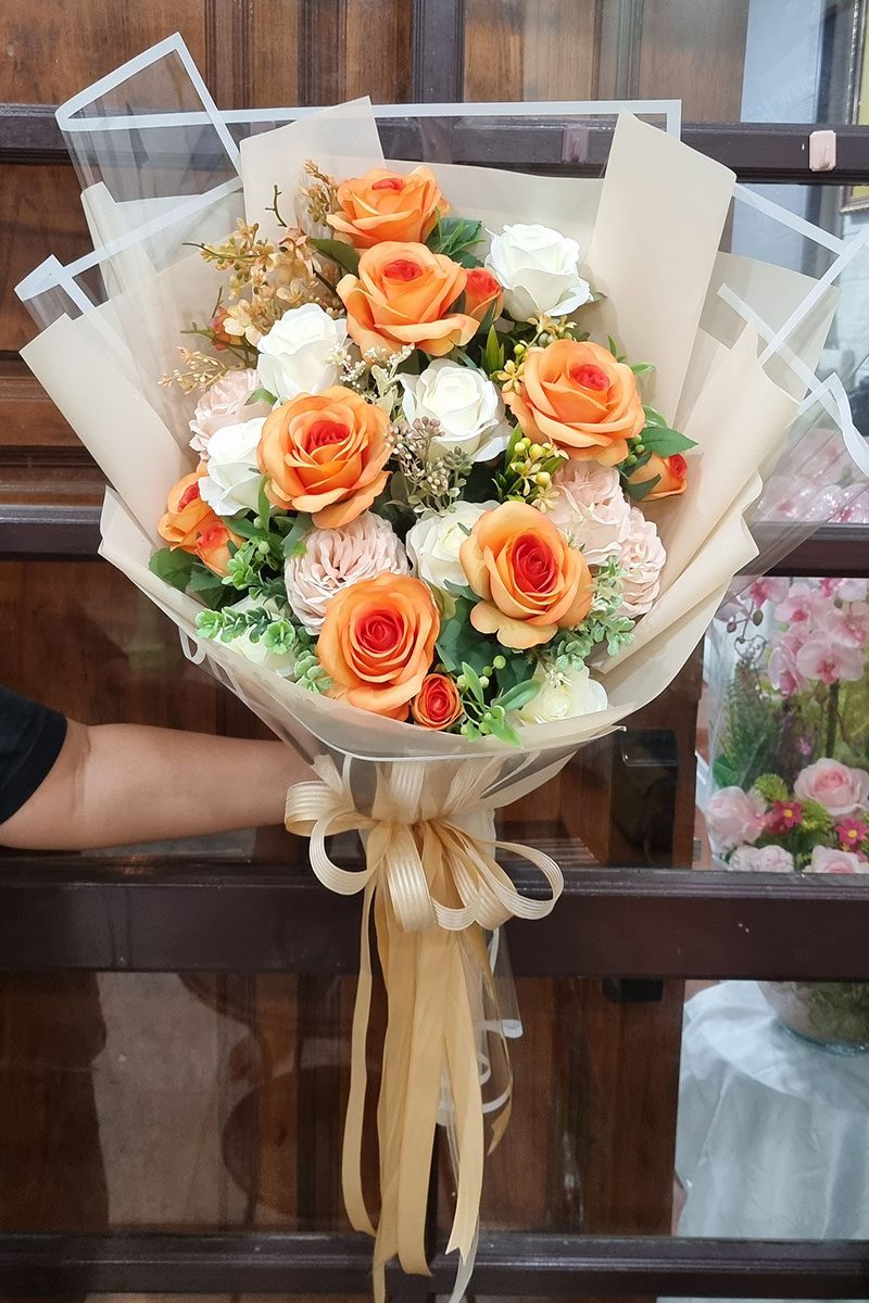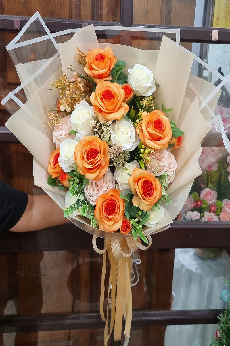 ดอกไม้ประดิษฐ์จัดช่อ โทนสีส้ม สดใส สวยเหมือนจริง