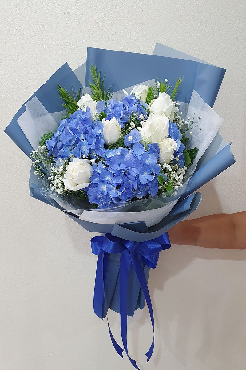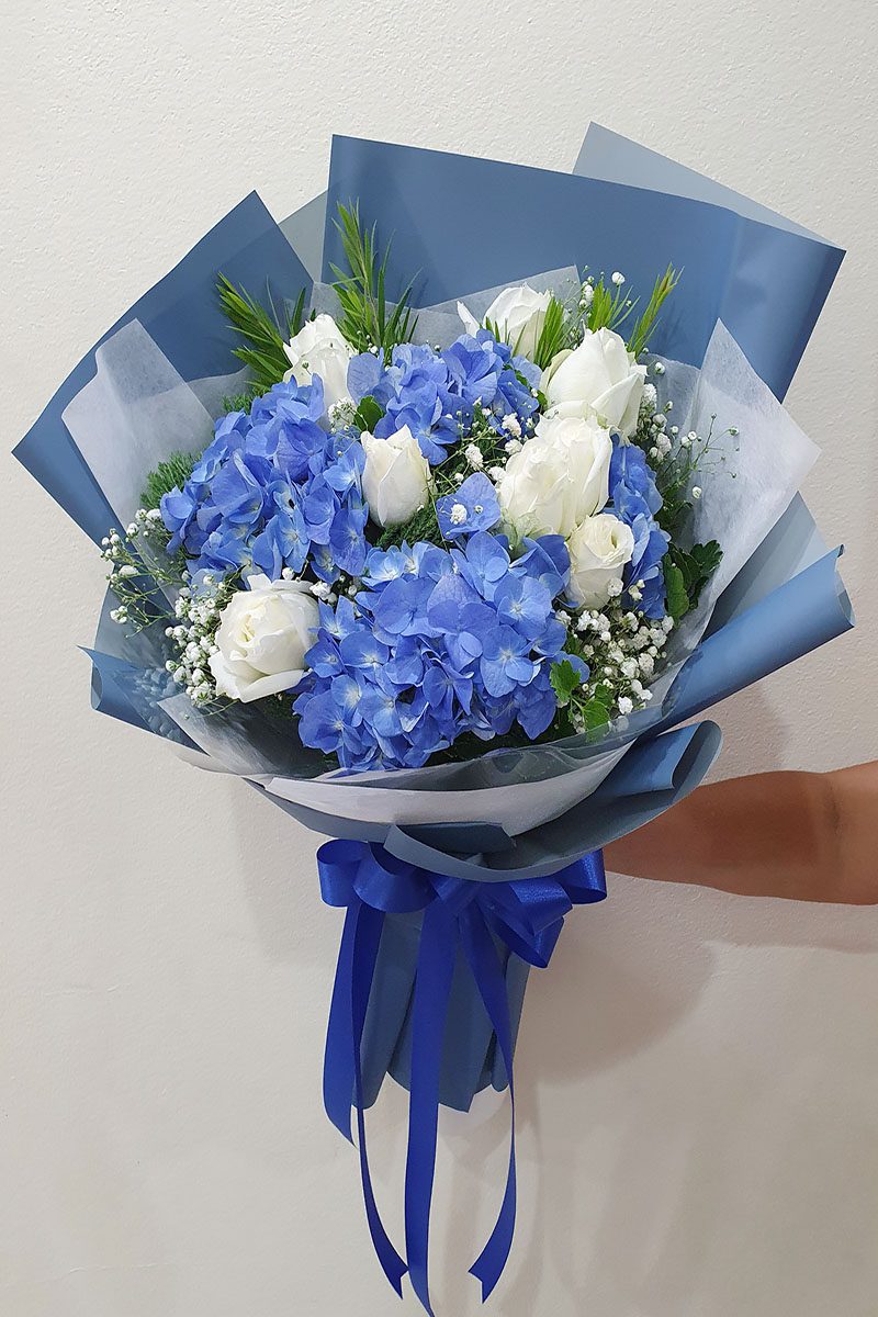 ดอกไฮเดรนเยียสีฟ้า  ดอกกุหลาบขาว จัดช่อ แซมดอกยิปซี แคสเปียร์