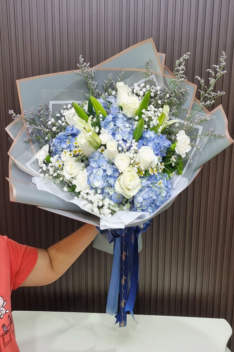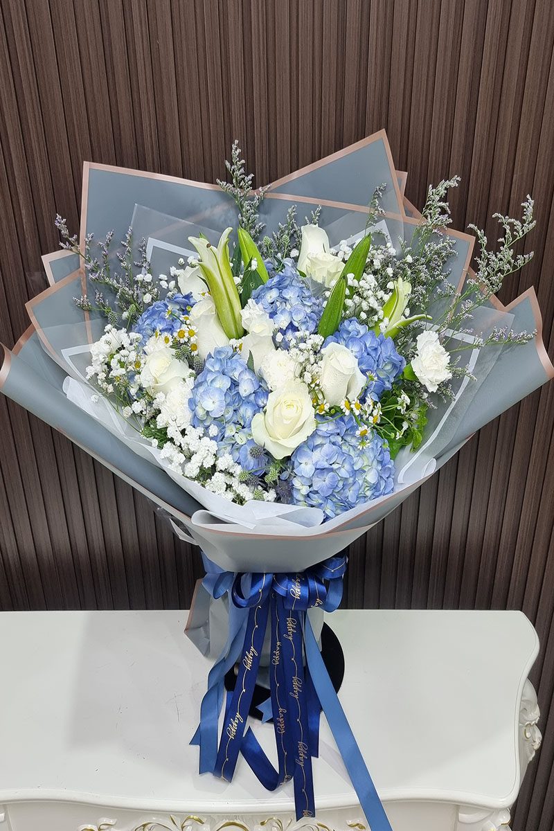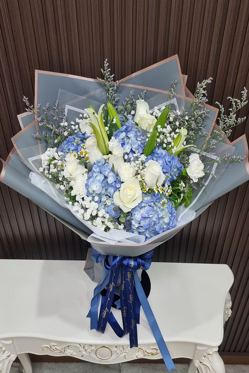 ดอกไฮเดรนเยียสีฟ้า  ดอกลิลลี่ ดอกคานชั่น จัดช่อ แซมดอกยิปซี แคสเปียร์
