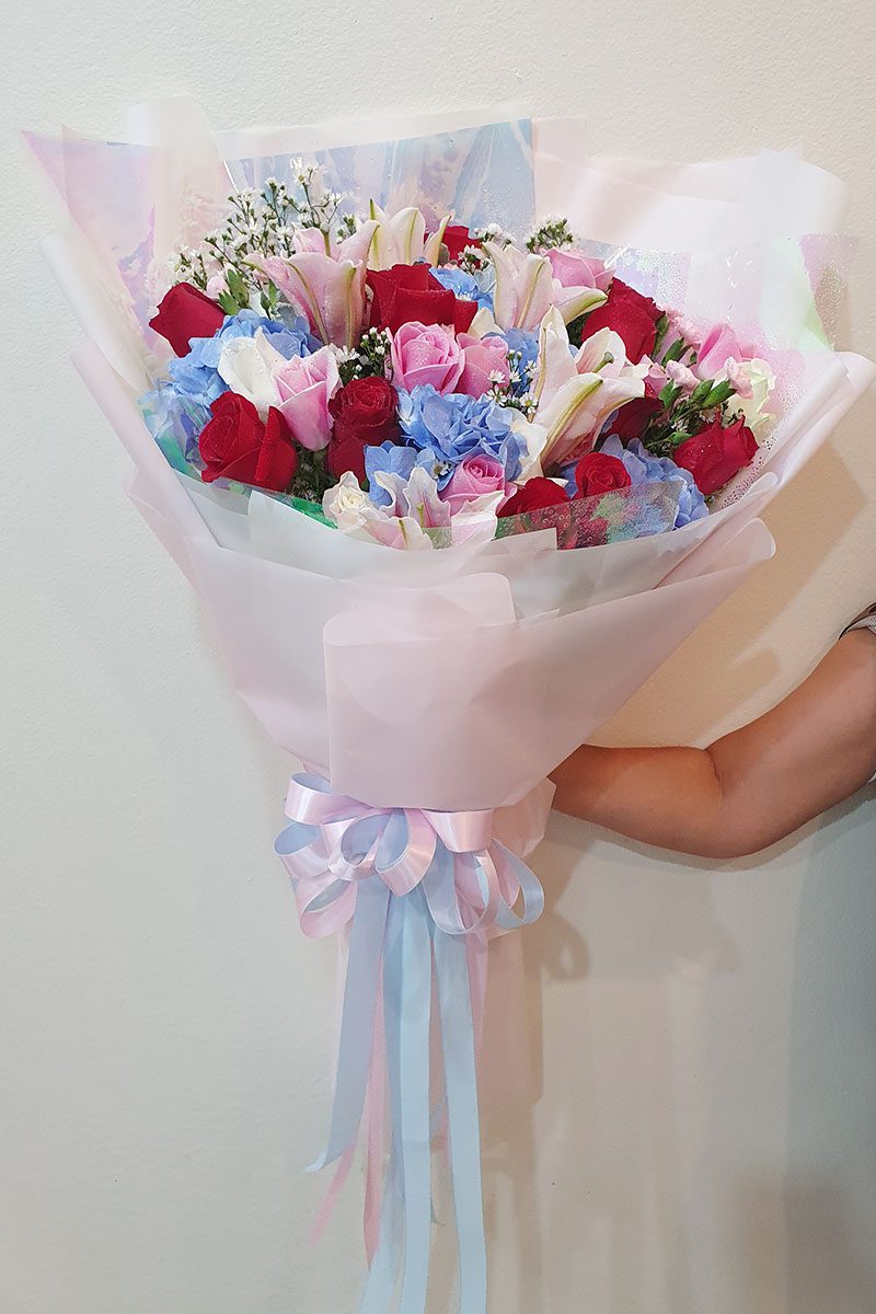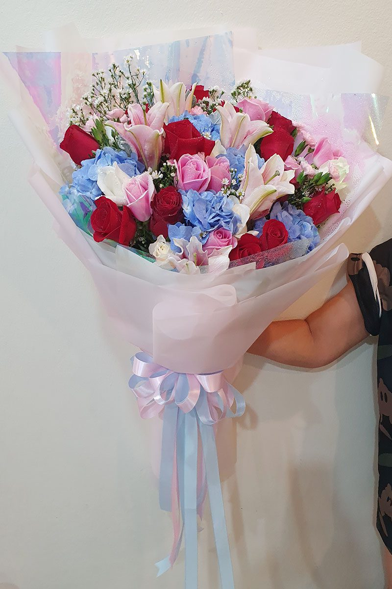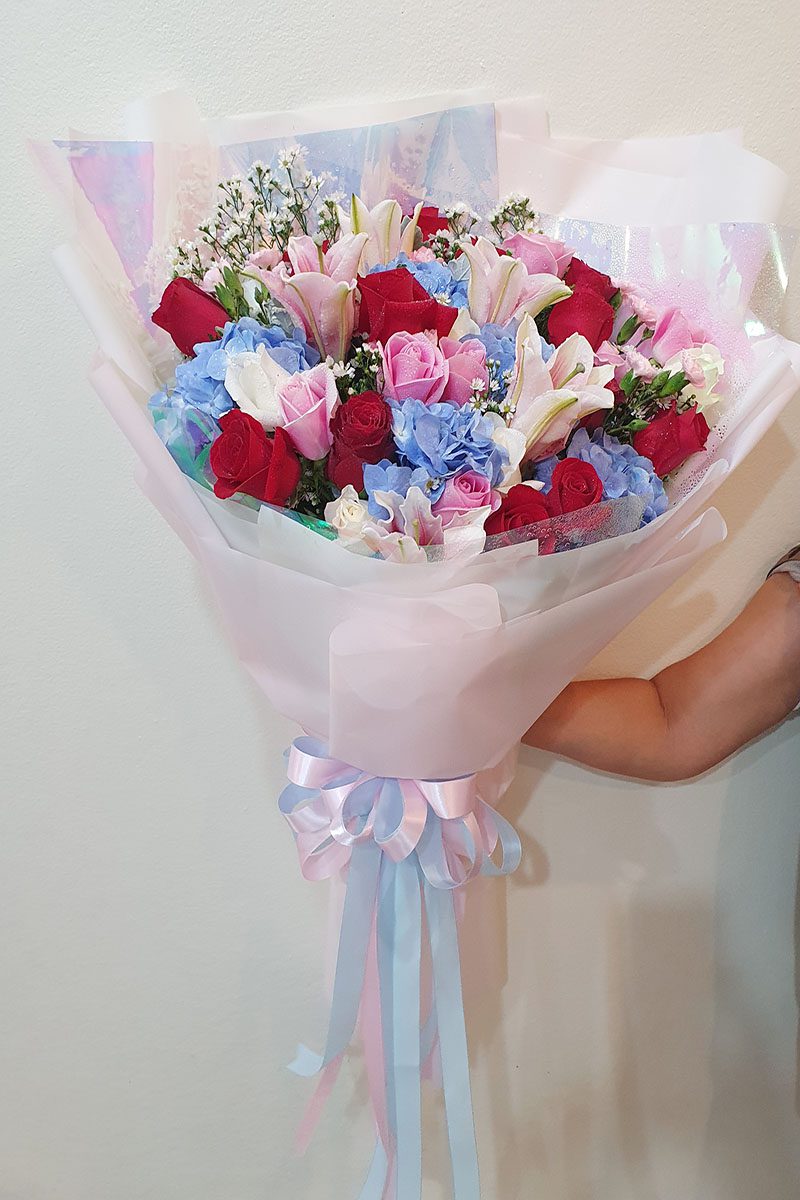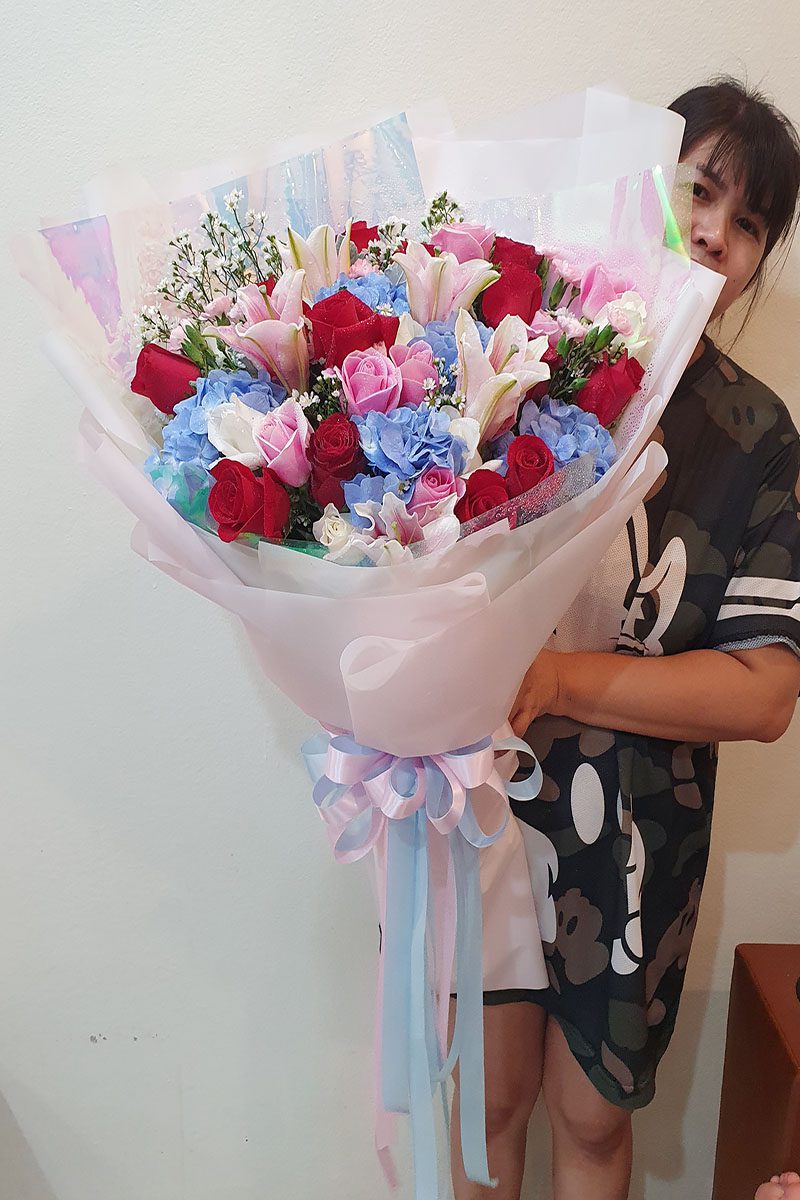 ดอกไฮเดรนเยีย ดอกกุหลาบ ดอกคาเนชั่น และดอกลิลลี่ จัดช่อ แซมดอกยิปซี