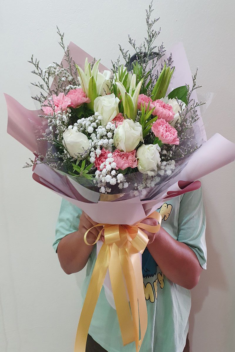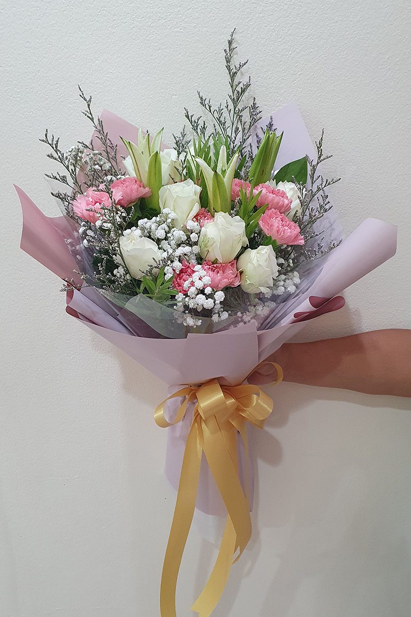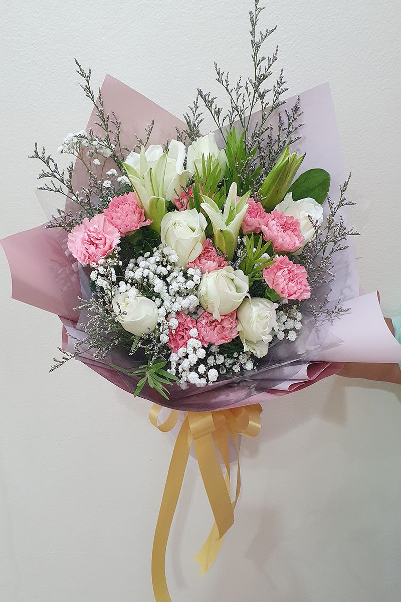 ช่อดอกสดรวมสี ขาวชมพู ประกอบไปด้วยดอกไม้ หลักคือ
