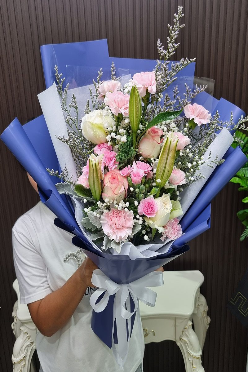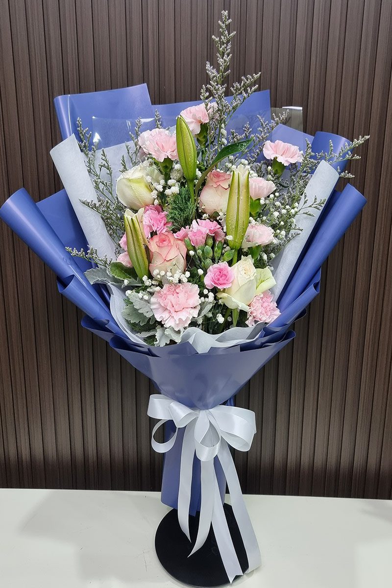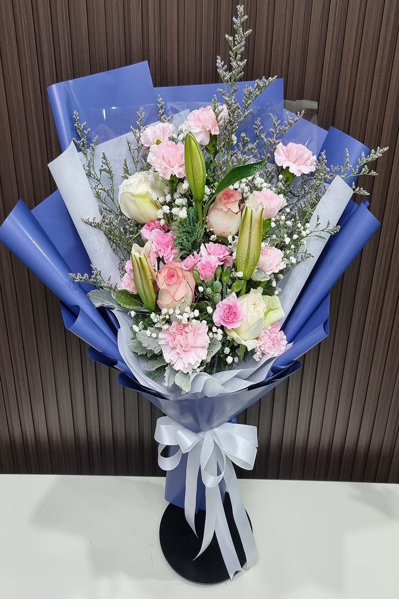 ดอกกุหลาบ  ดอกลิลลี่ และดอกคานชั่น จัดช่อ แซมดอกยิปซี แคสเปียร์
