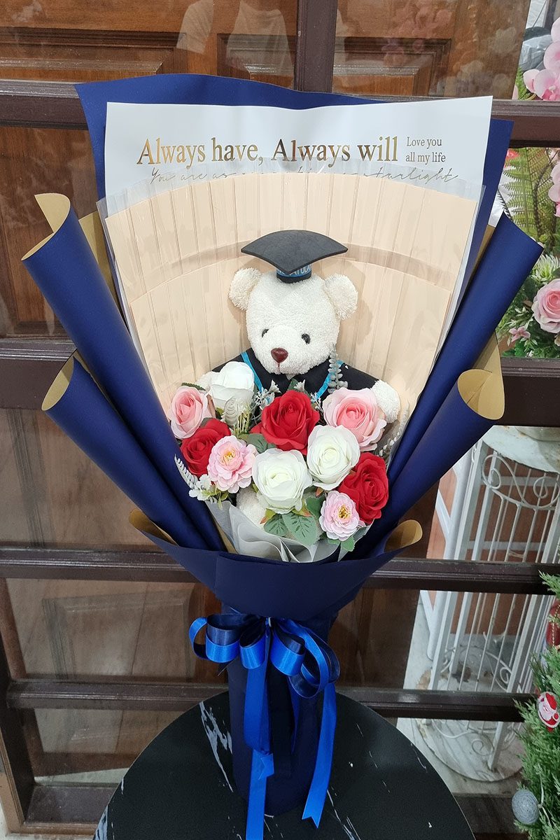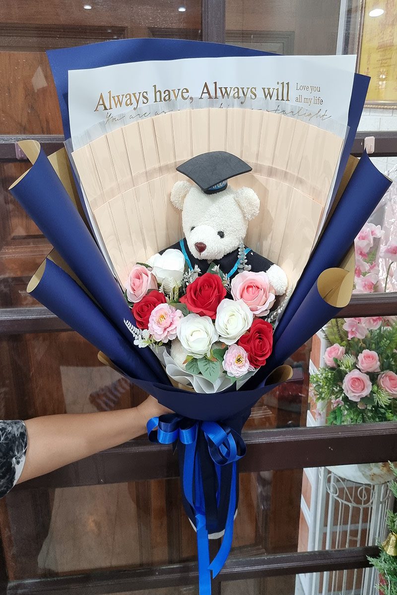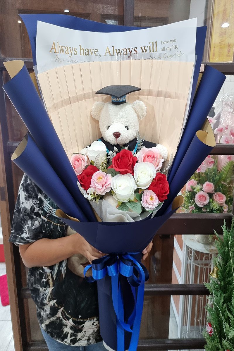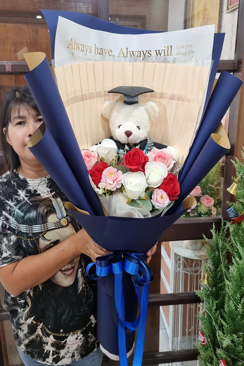 ชุดตุ๊กตาหมีกับช่อดอกไม้