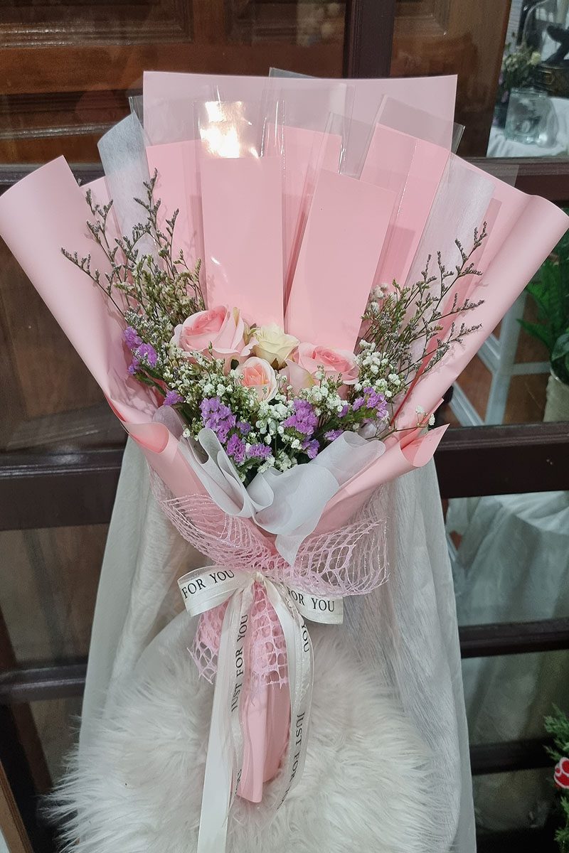 กระเช้าดอกไม้สดโทนสีอ่อน-สีชมพู