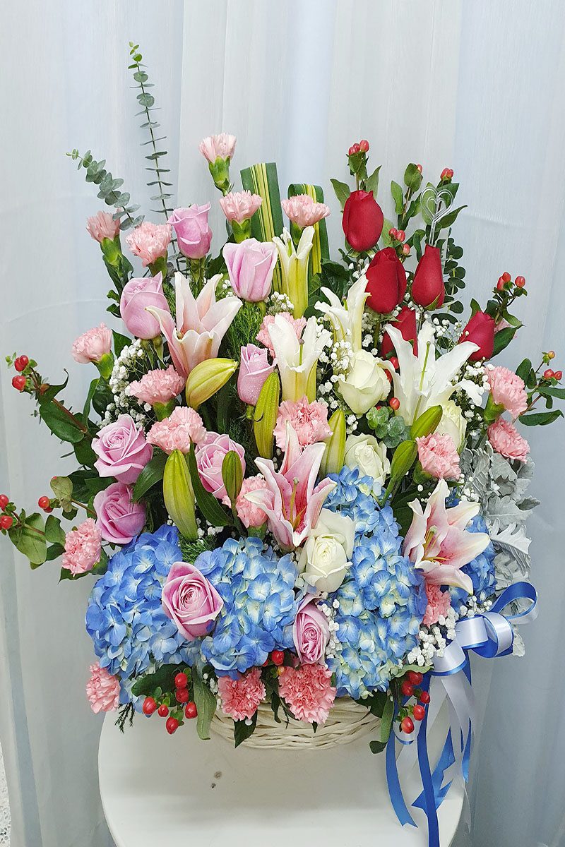 กระเช้าดอกไม้สีฟ้าชมพูโอรส