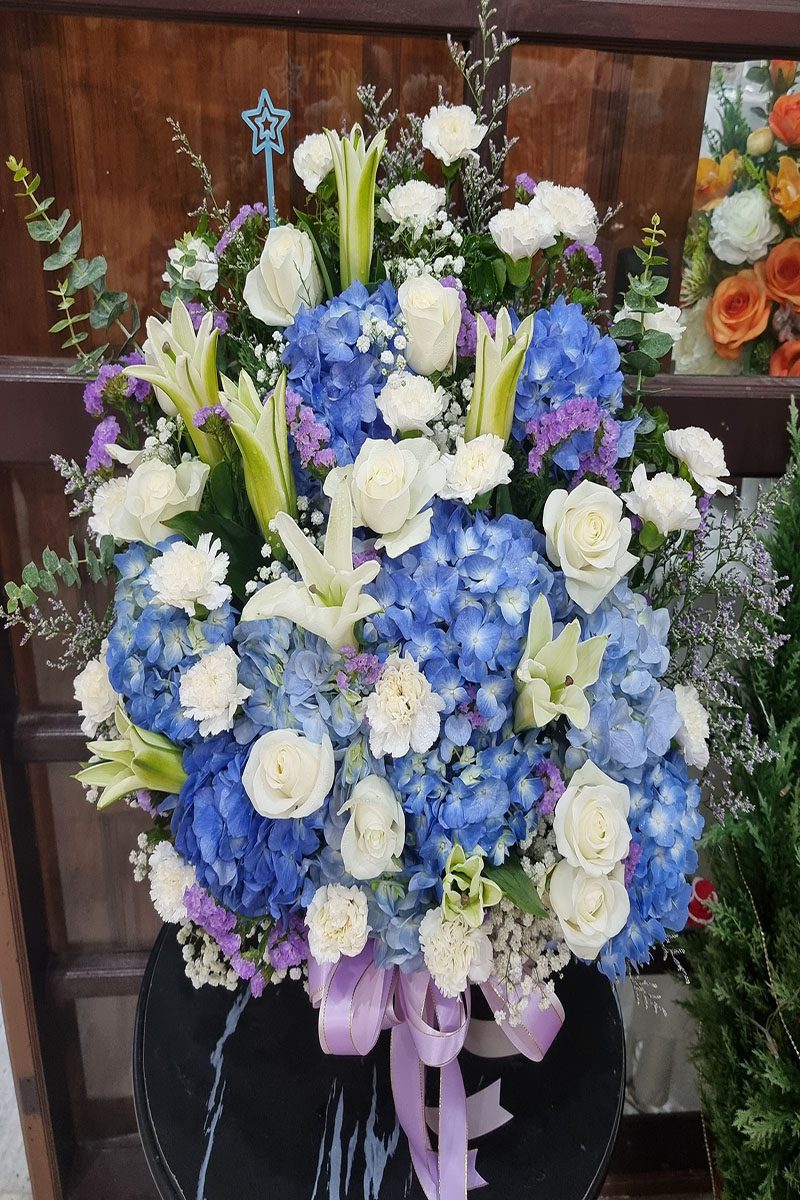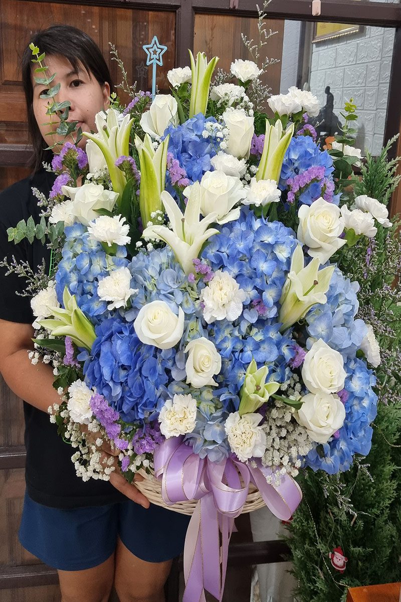 กระเช้าดอกไม้สีฟ้า กระเช้าดอกไม้สีฟ้า สื่อถึงความสงบ สันติสุข ความภักดี และความไว้วางใจ เหมาะสำหรับมอบให้กับบุคคลพิเศษ เพื่อแสดงความห่วงใย กำลังใจ หรือเพื่ออวยพรให้ประสบความสำเร็จ
