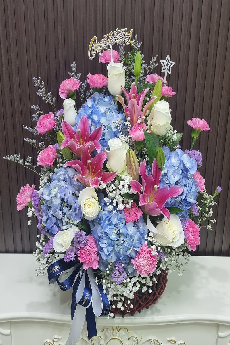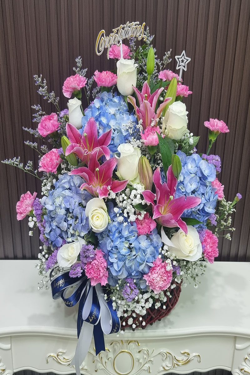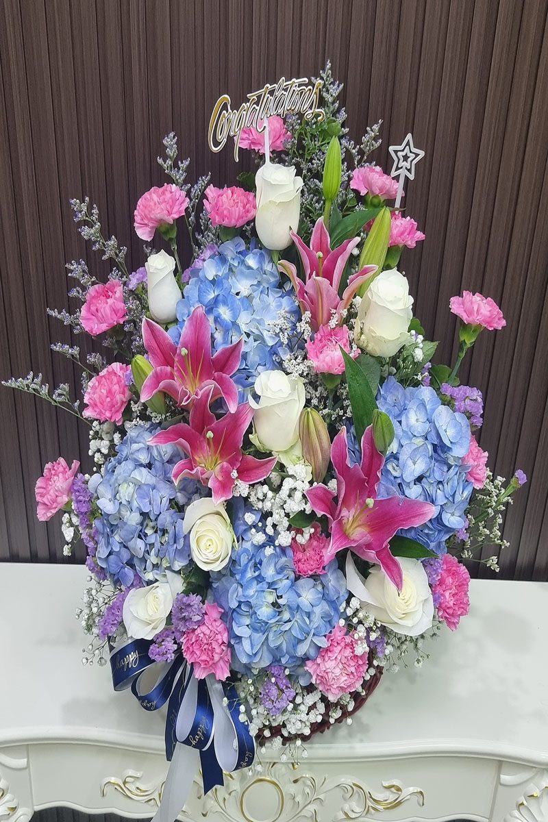 กระเช้าดอกไม้สีฟ้าชมพู-BB1010
