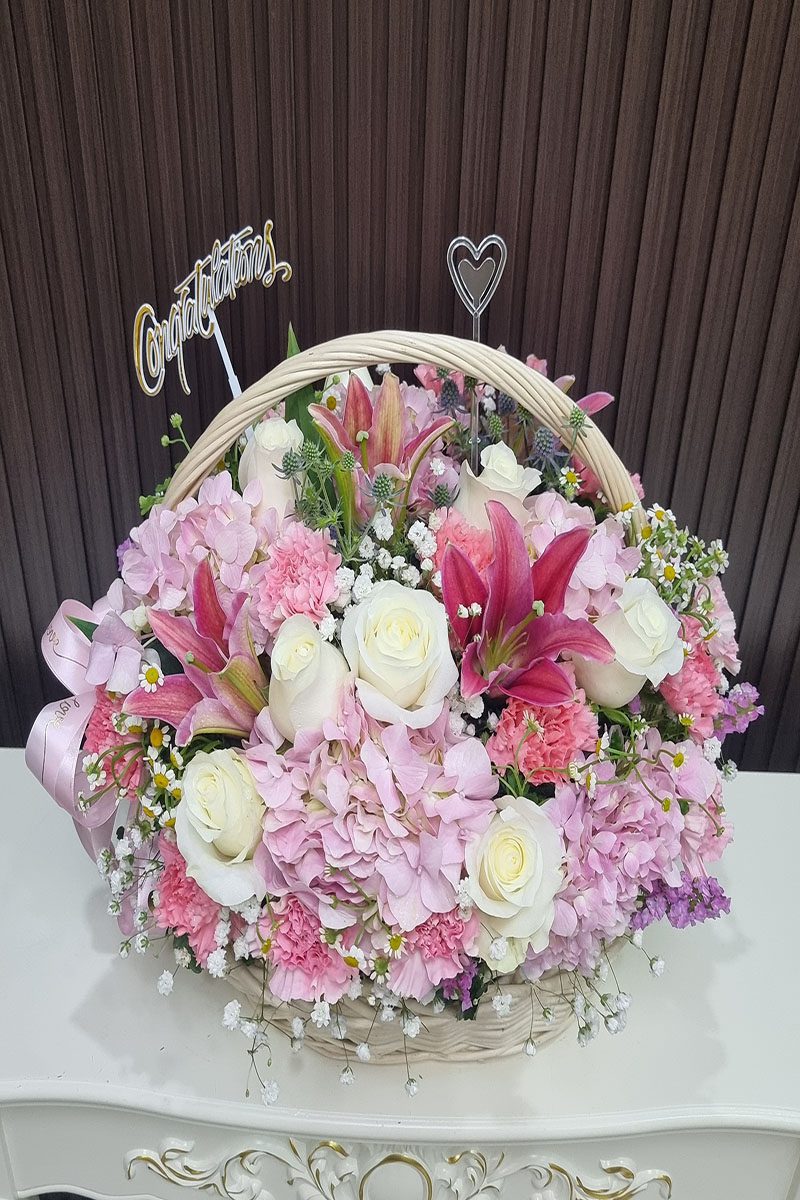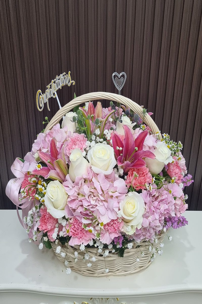 กระเช้าดอกไม้สดสีชมพู  ความสดใส อ่อนหวาน เต็มไปด้วยเสน่ห์: