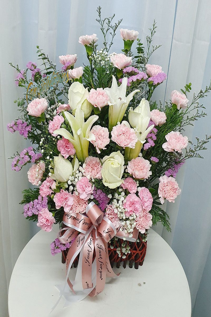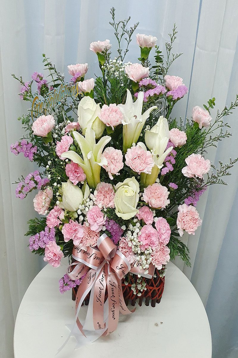 กระเช้าดอกไม้สีชมพูขาว