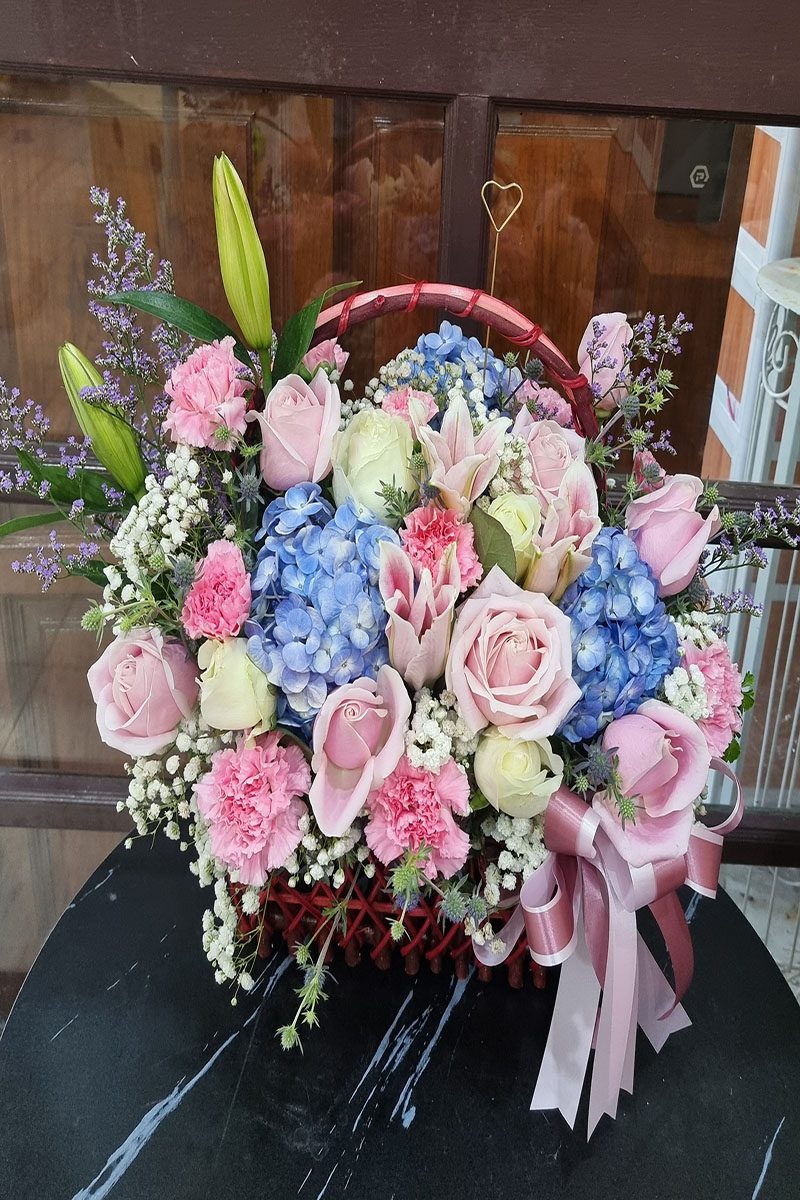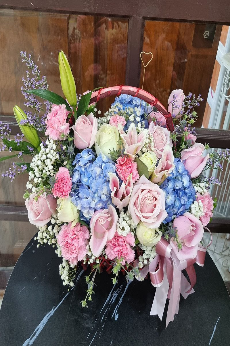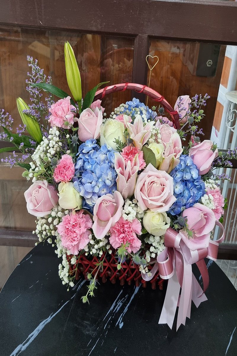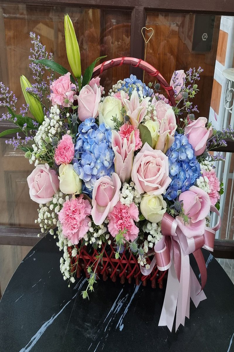 กระเช้าดอกไม้สด สีชมพู ฟ้า