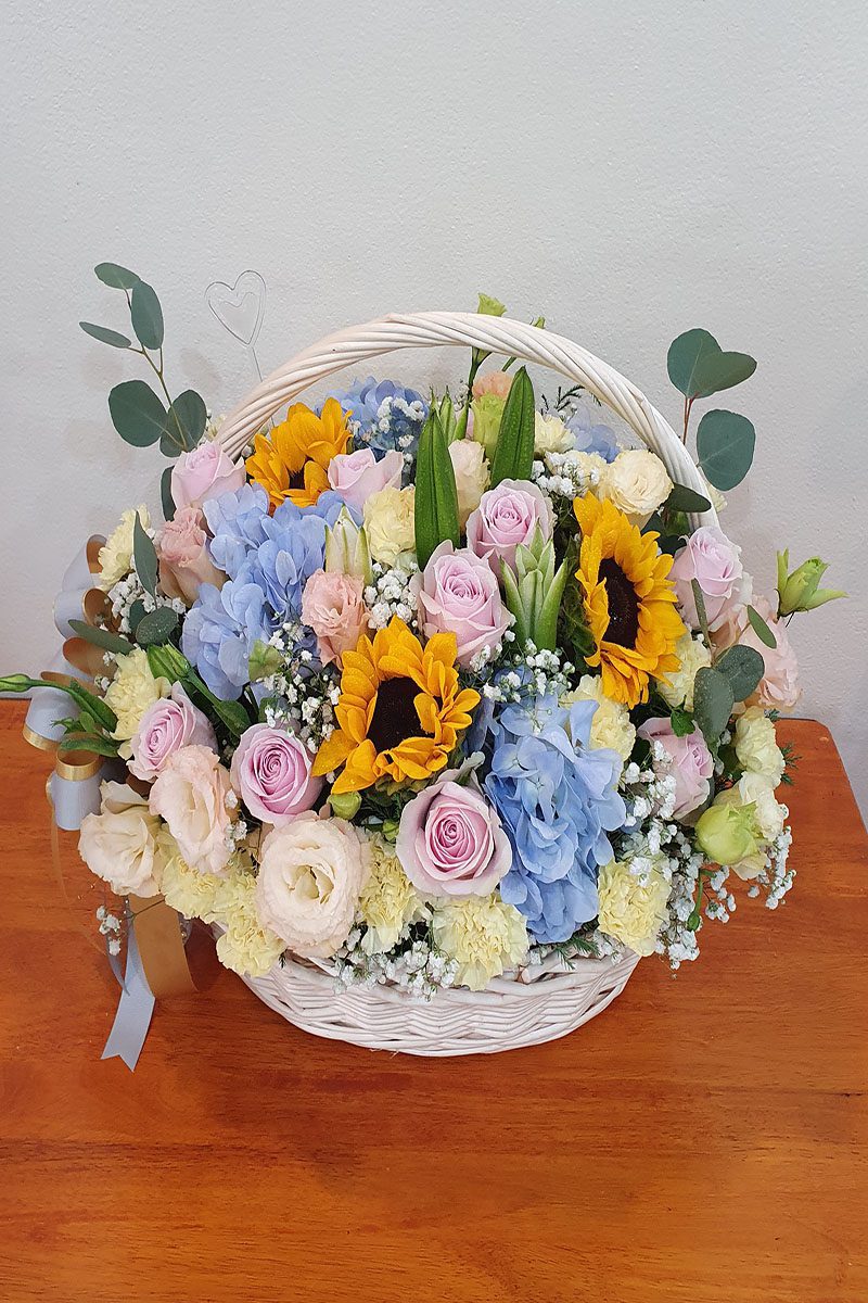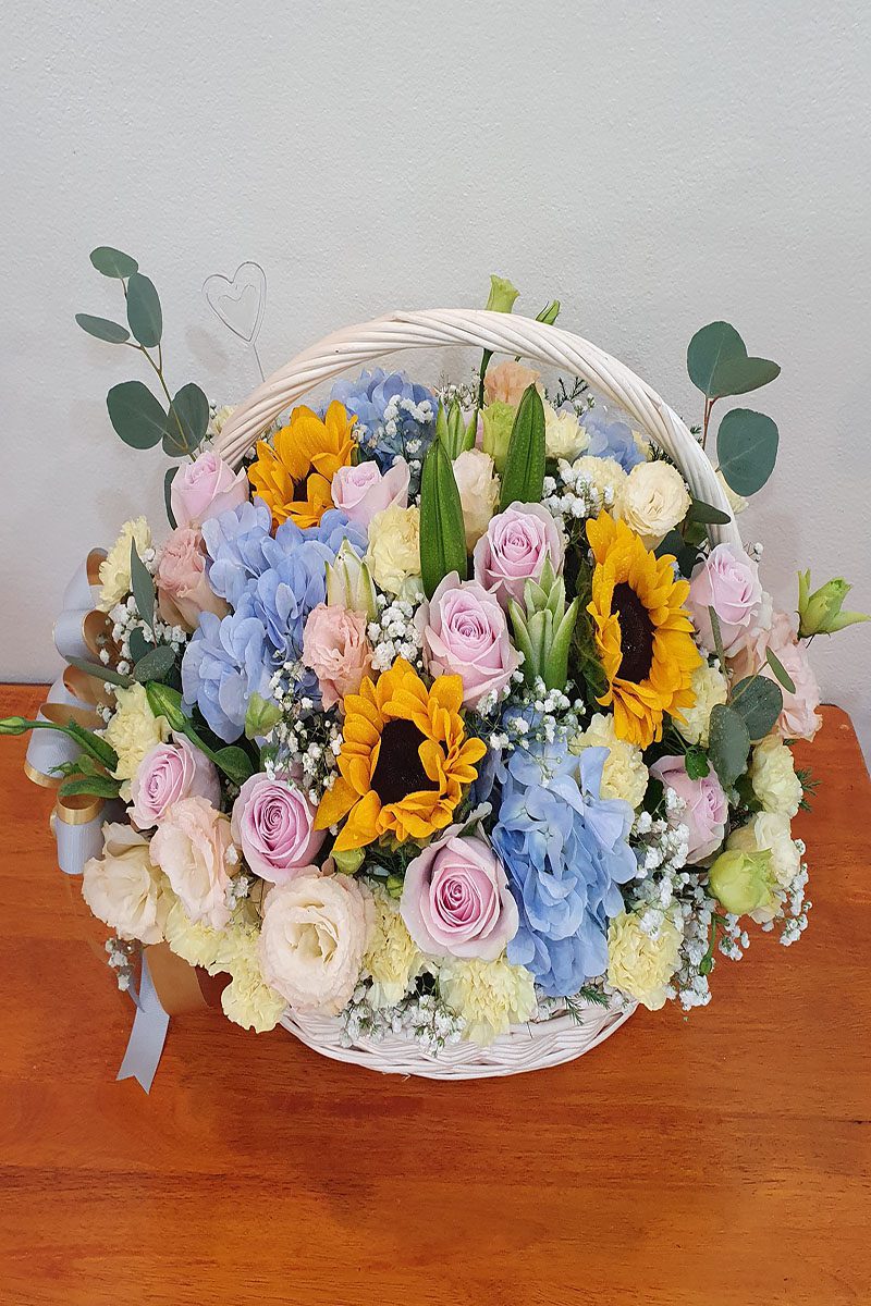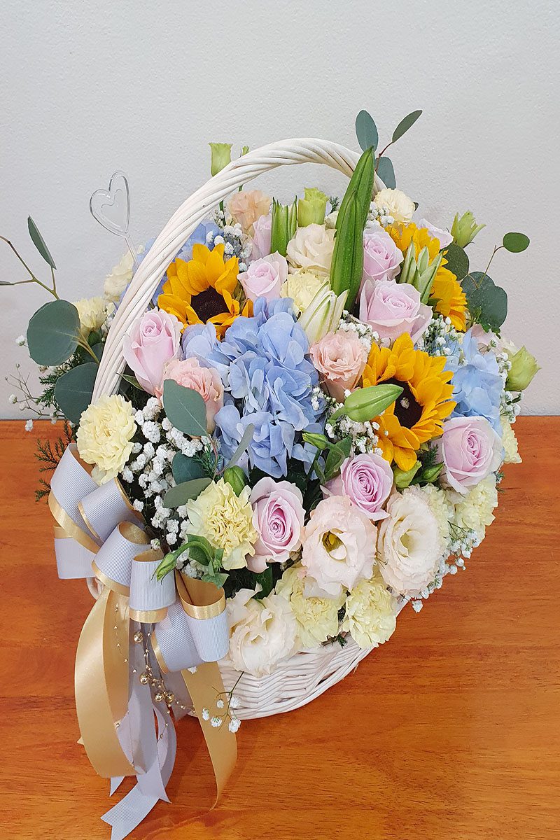 กระเช้าดอกไม้สดสีม่วงฟ้า