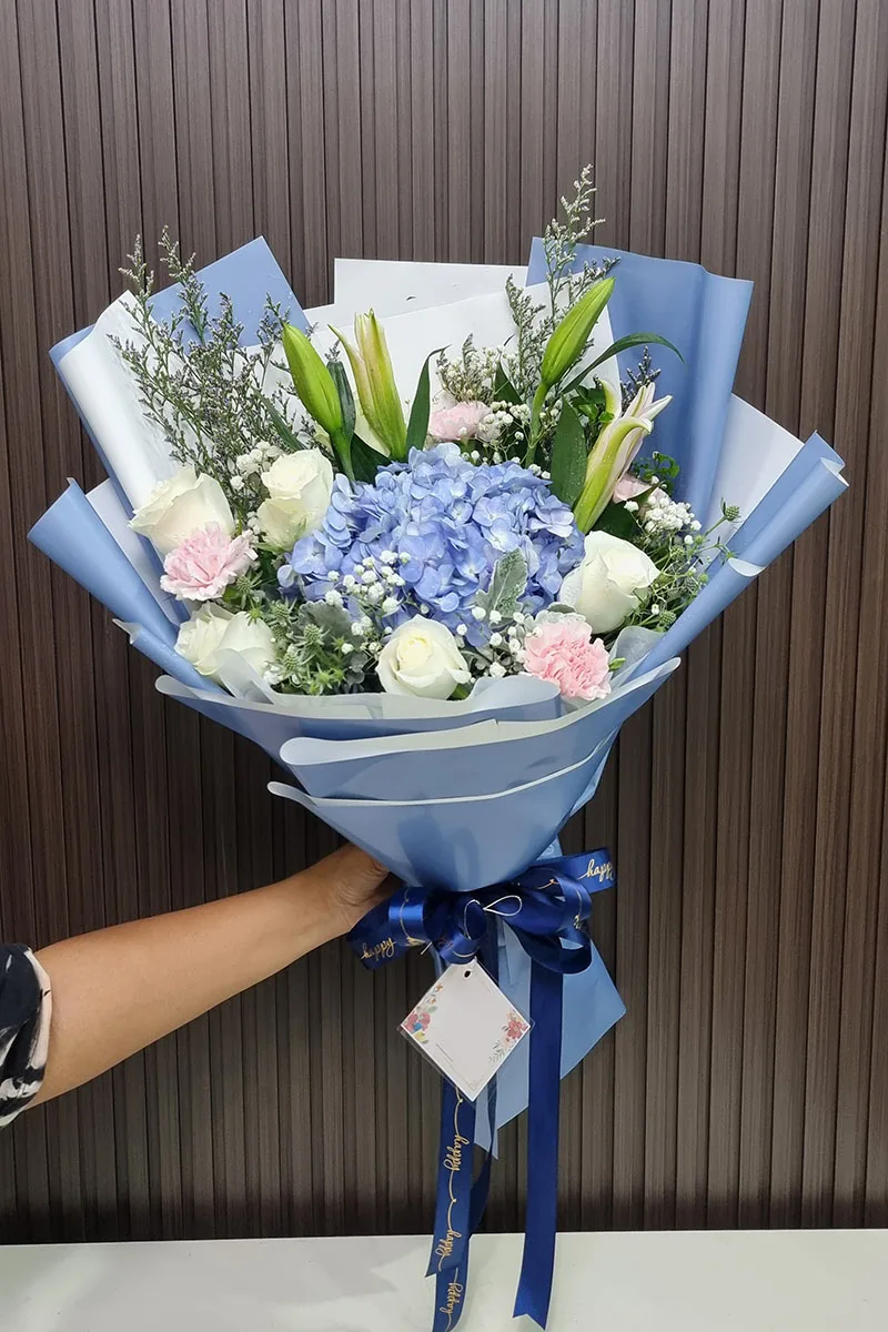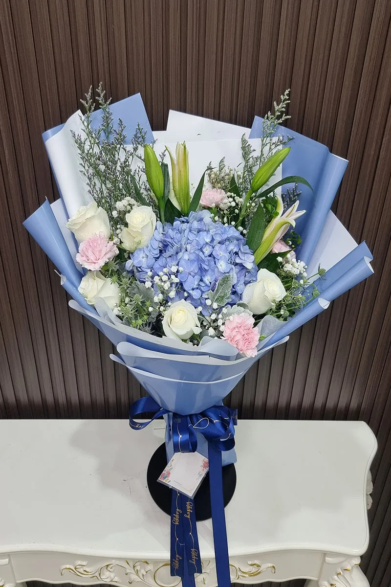 ดอกไฮเดรนเยียสีฟ้า  ดอกลิลลี่ ดอกคานชั่น จัดช่อ แซมดอกยิปซี แคสเปียร์