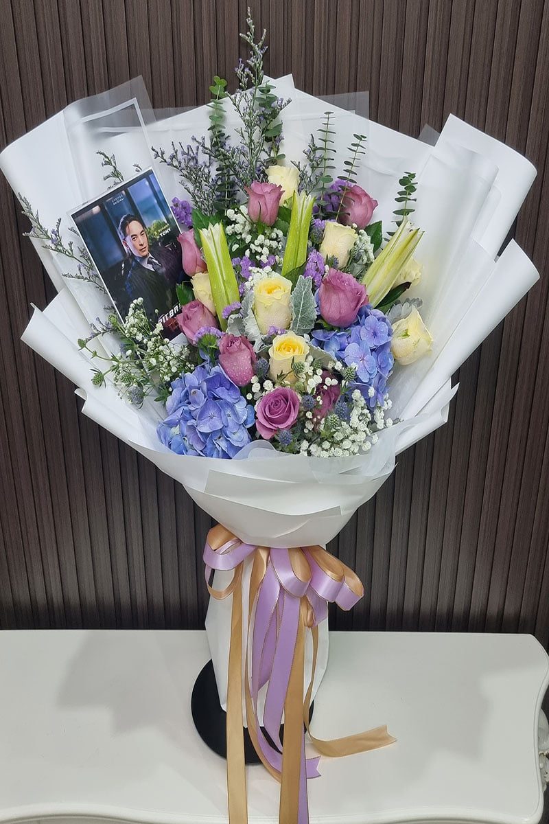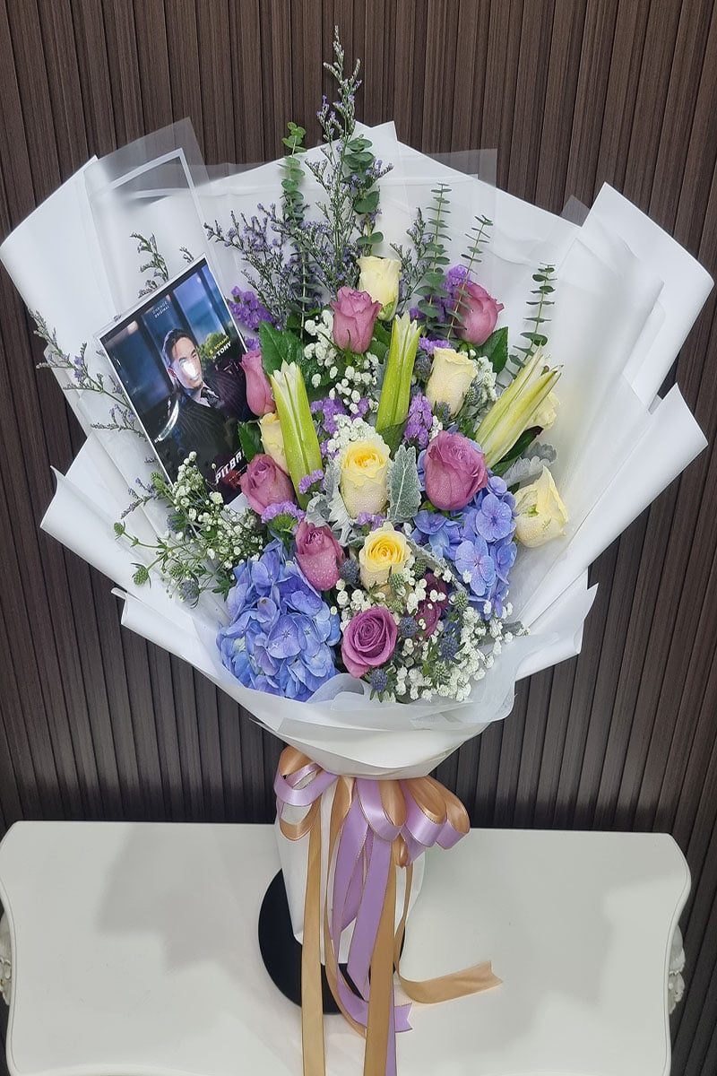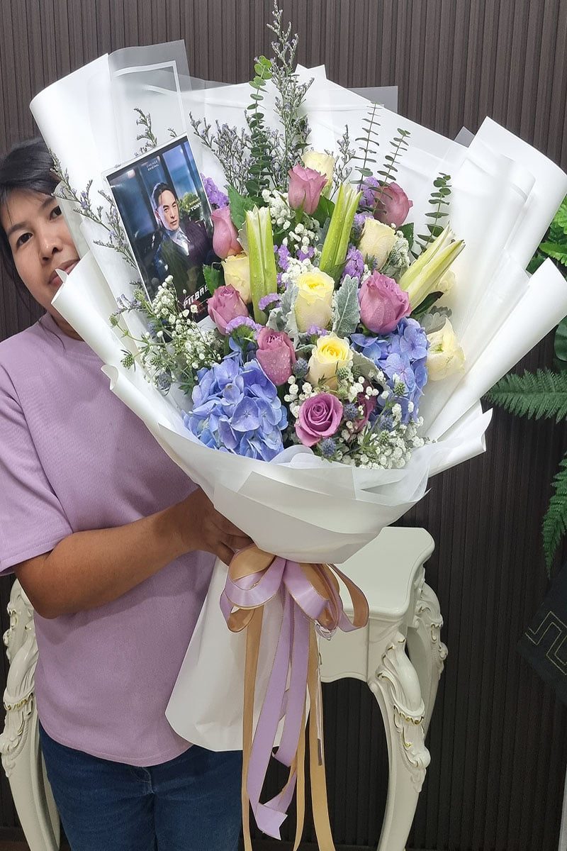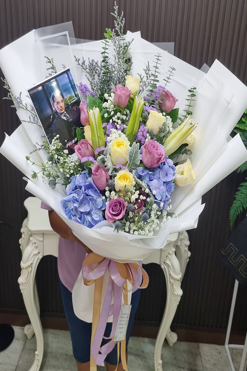 ดอกกุหลาบสีม่วง ดอกไฮเดรนเยีย  ดอกคาเนชั่น และดอกลิลลี่  จัดช่อ แซมดอกยิปซี