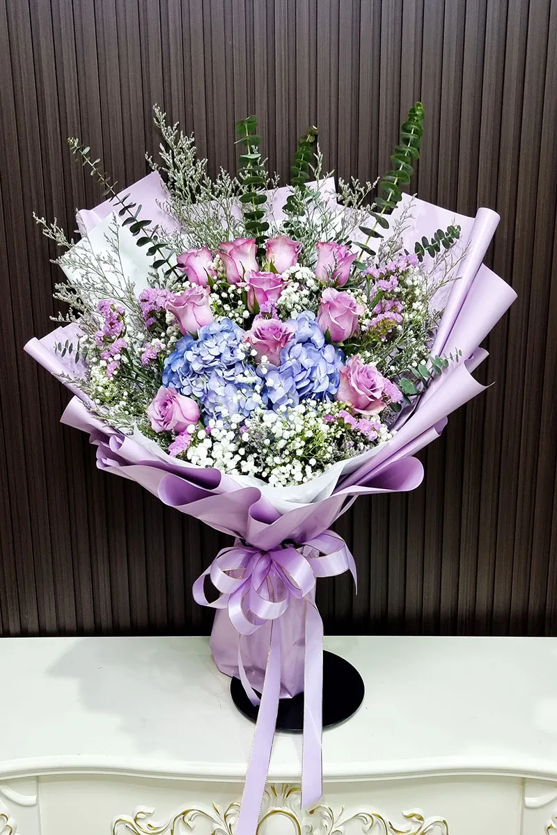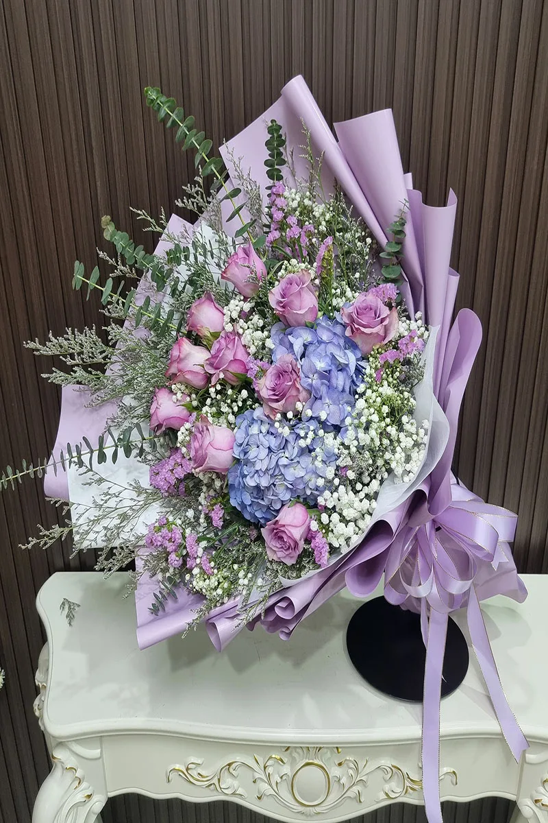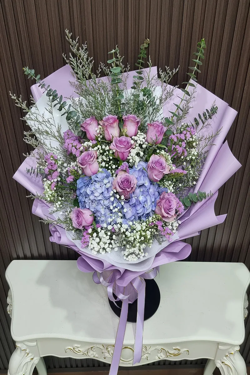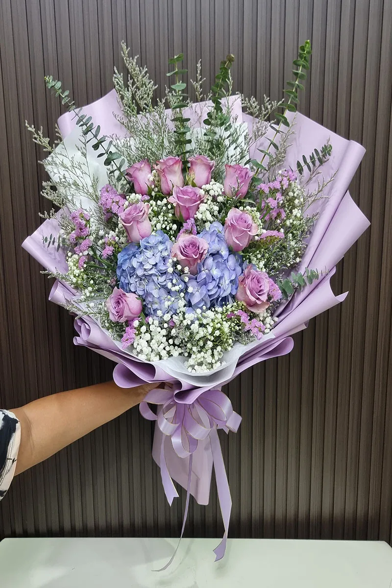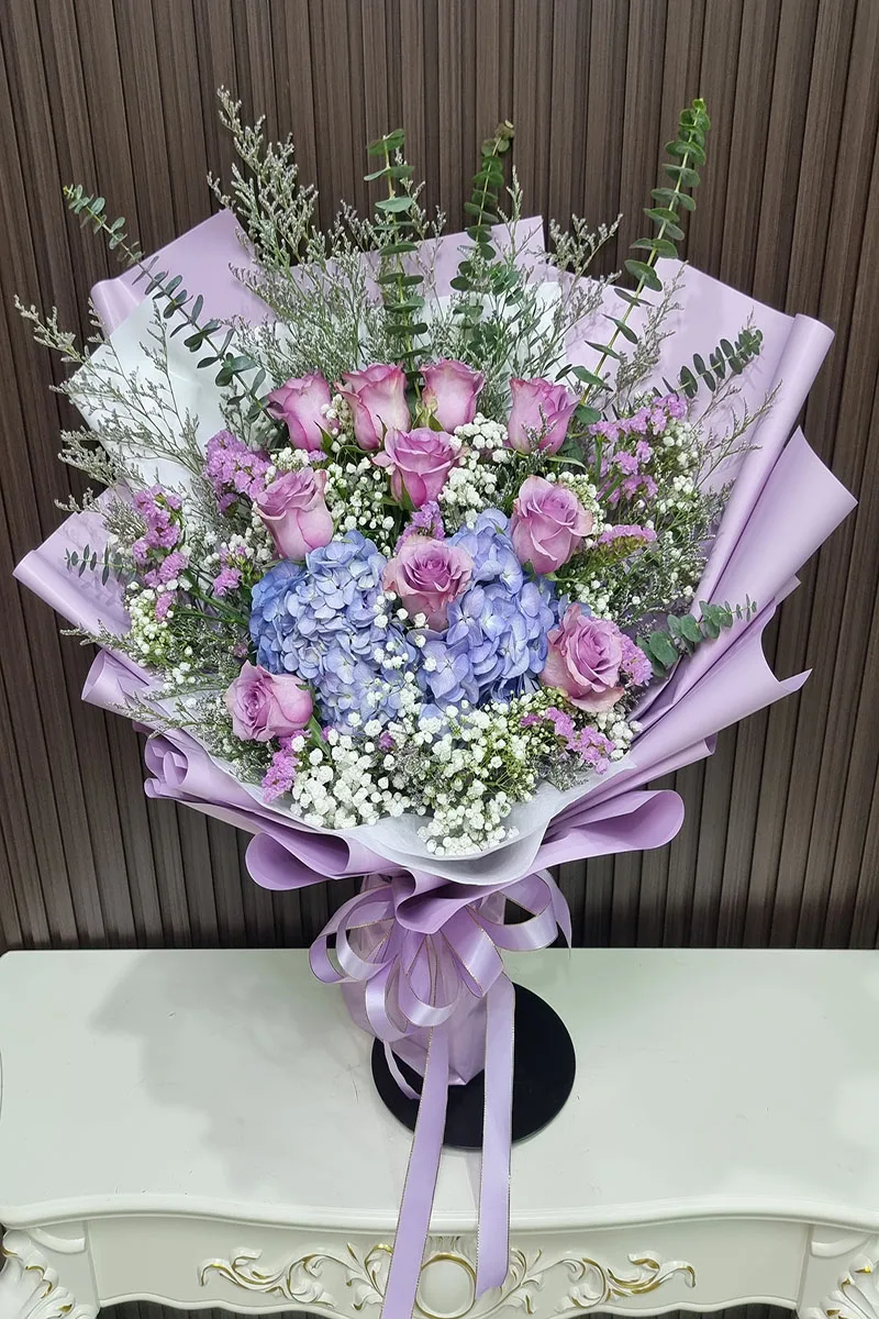 ดอกไฮเดรนเยีย สีม่วง ดอกกุหลาบม่วง  จัดช่อ แซมดอกยิปซี