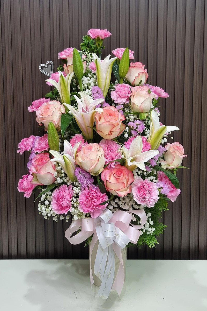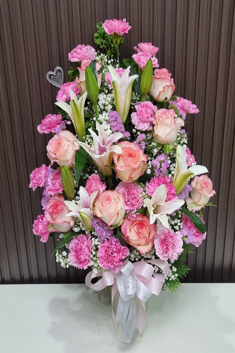 แจกันดอกไม้สด  สีชมพู ประกอบไปด้วยดอกไม้ หลักคือ