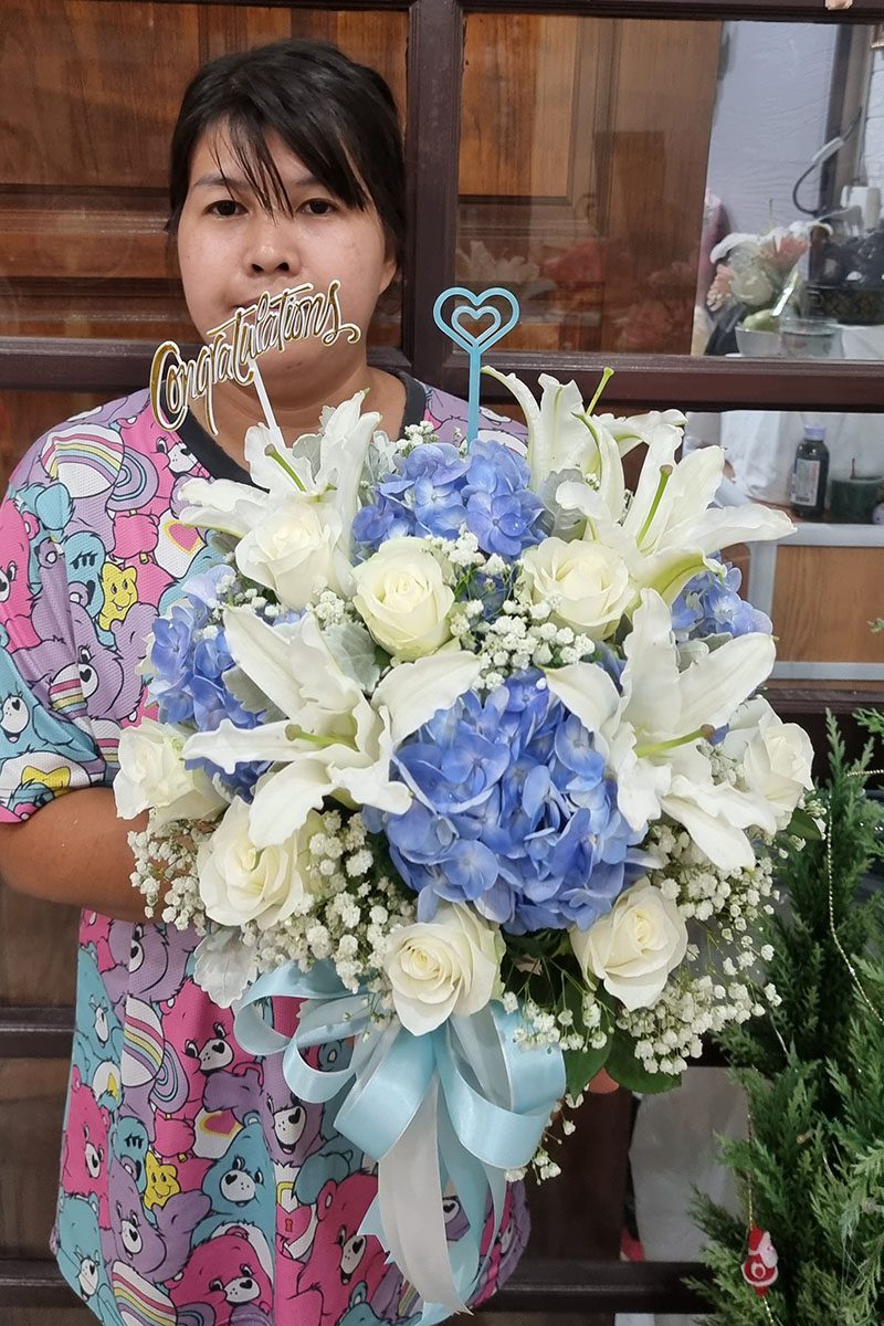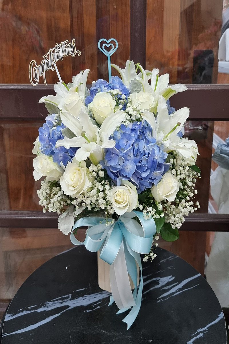 แจกันดอกไม้สด  สีฟ้า ขาว ประกอบไปด้วยดอกไม้ หลักคือ