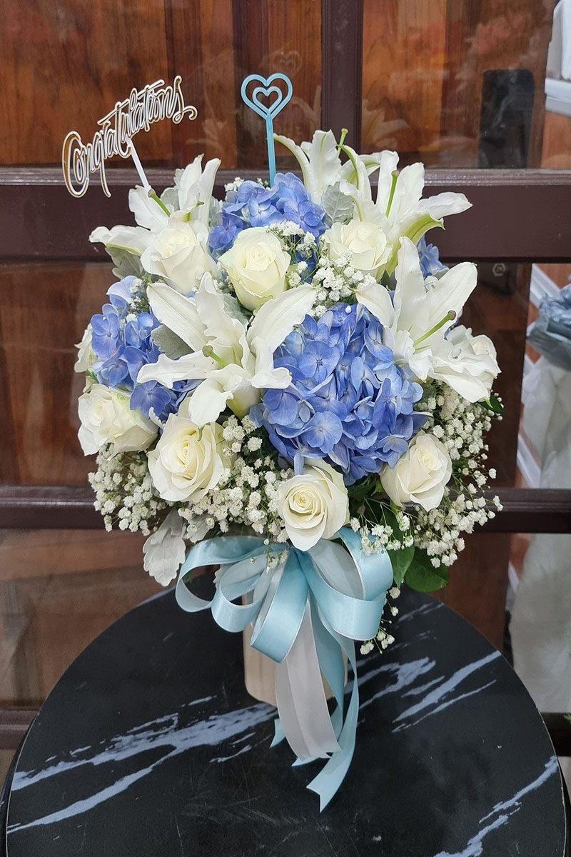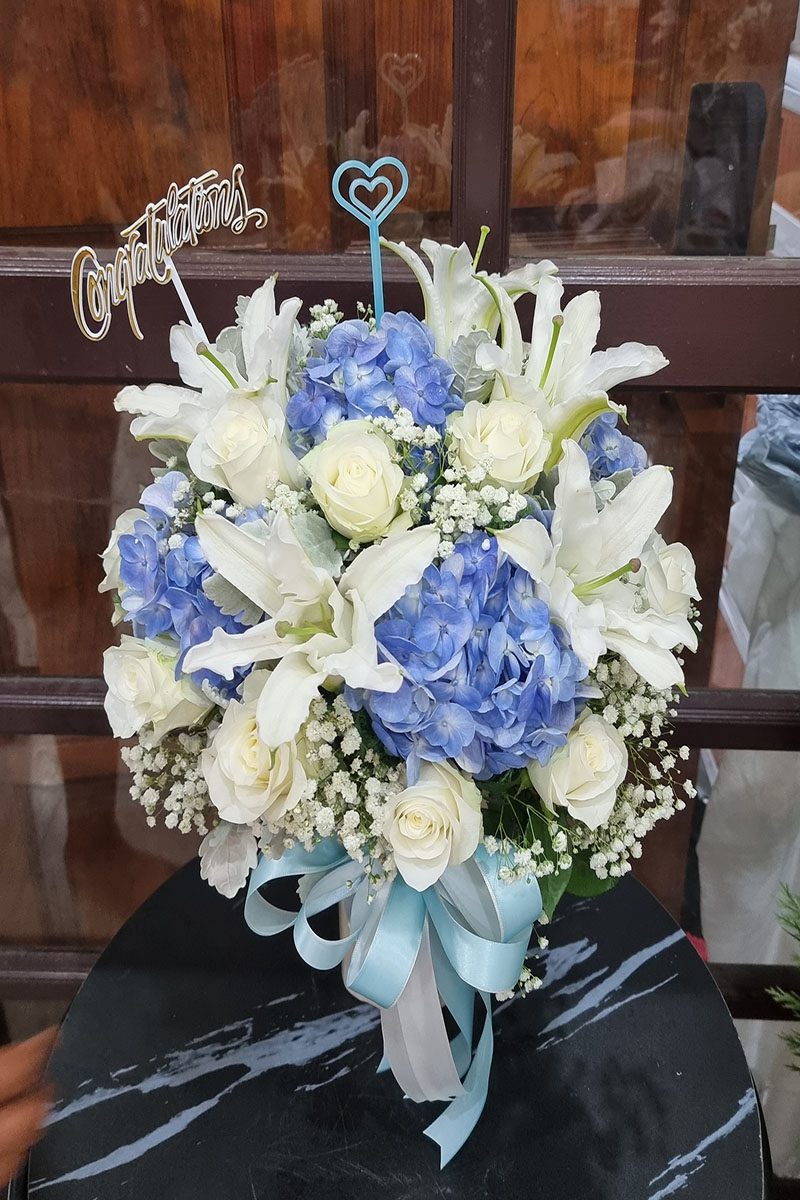 ดอกไฮเดรนเยียฟ้า ดอกกุหลาบขาว  และดอกลิลลี่  แซมดอกยิปซี