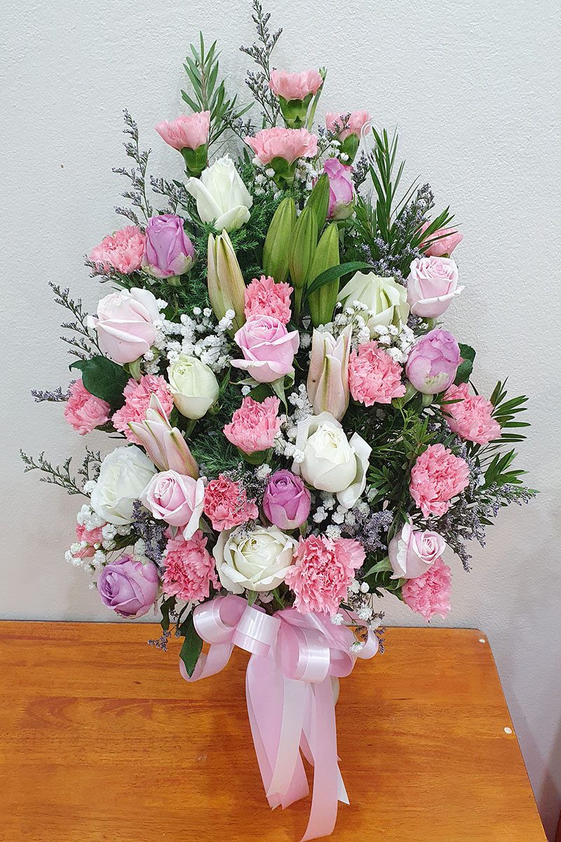 แจกันดอกไม้สด  สีชมพู ประกอบไปด้วยดอกไม้ หลักคือ