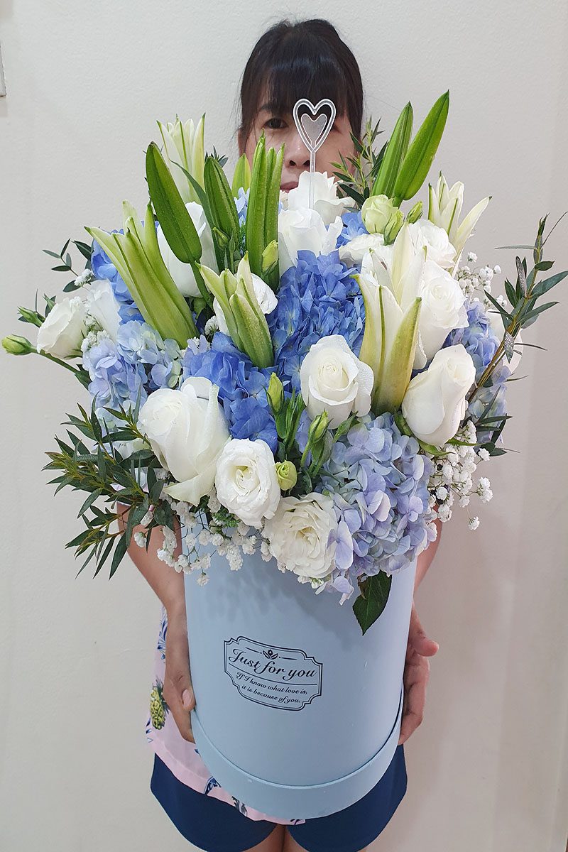 ดอกไฮเดรนเยียฟ้า ดอกกุหลาบขาว ดอกคาเนชั่น และดอกลิลลี่  แซมดอกยิปซี