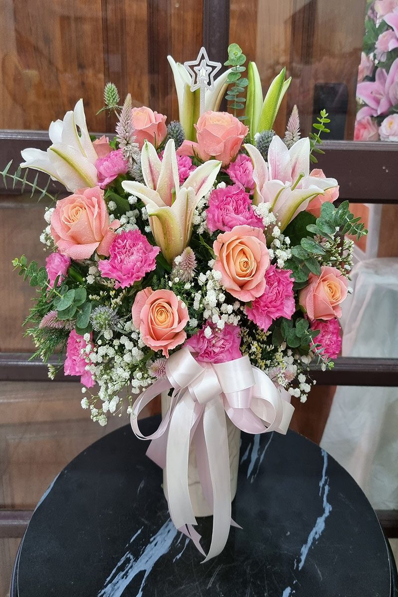 ดอกกุหลาบ ดอกคาเนชั่น และดอกลิลลี่  แซมดอกยิปซี