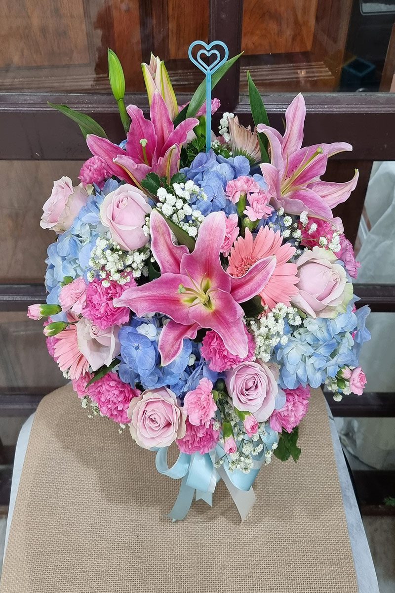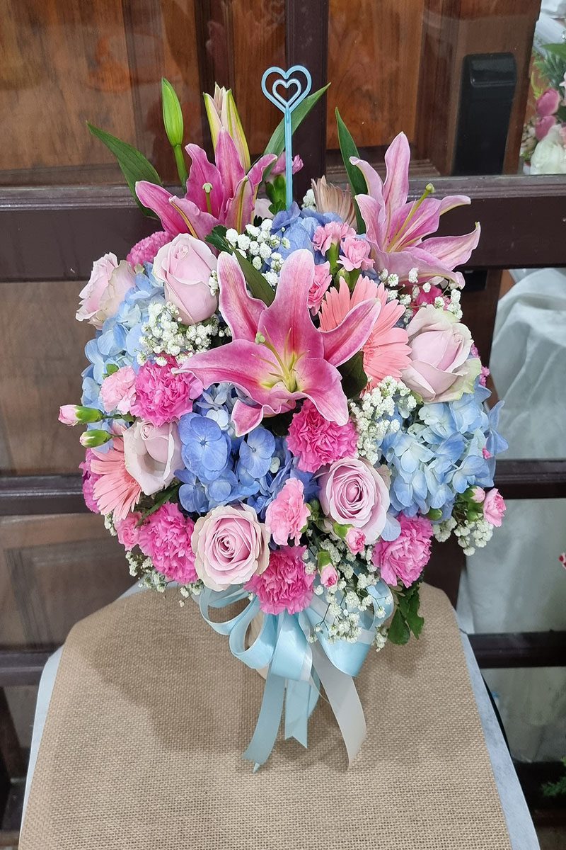 ดอกกุหลาบ ดอกคาเนชั่น ดอกไฮเดรนเยีย และดอกลิลลี่  แซมดอกยิปซี