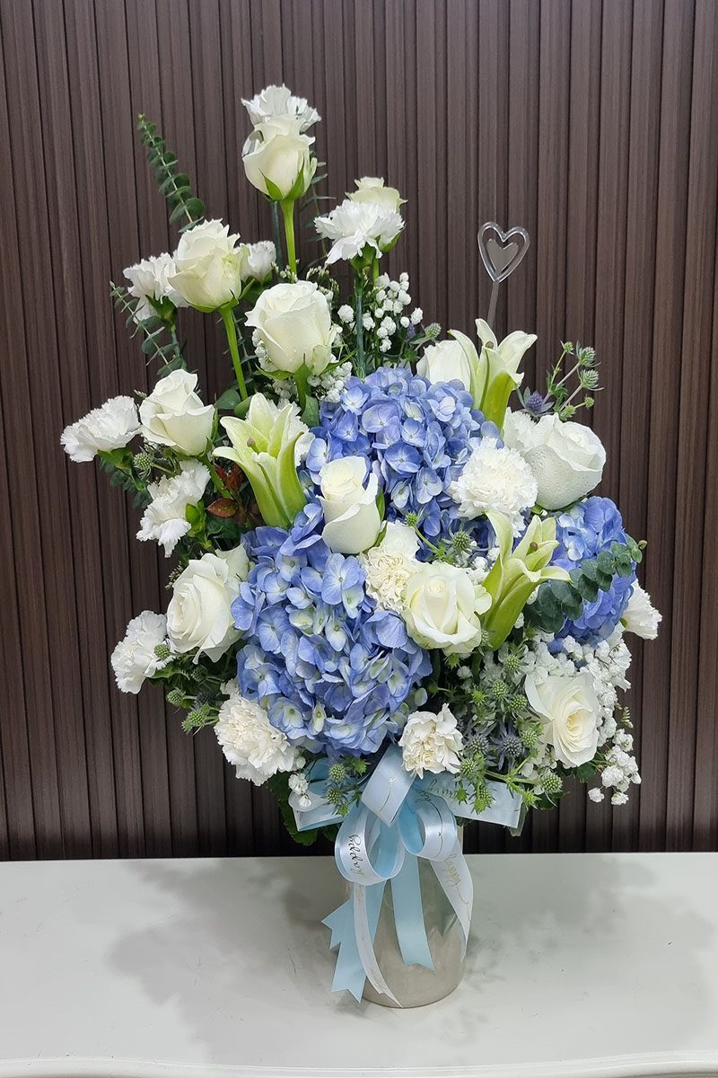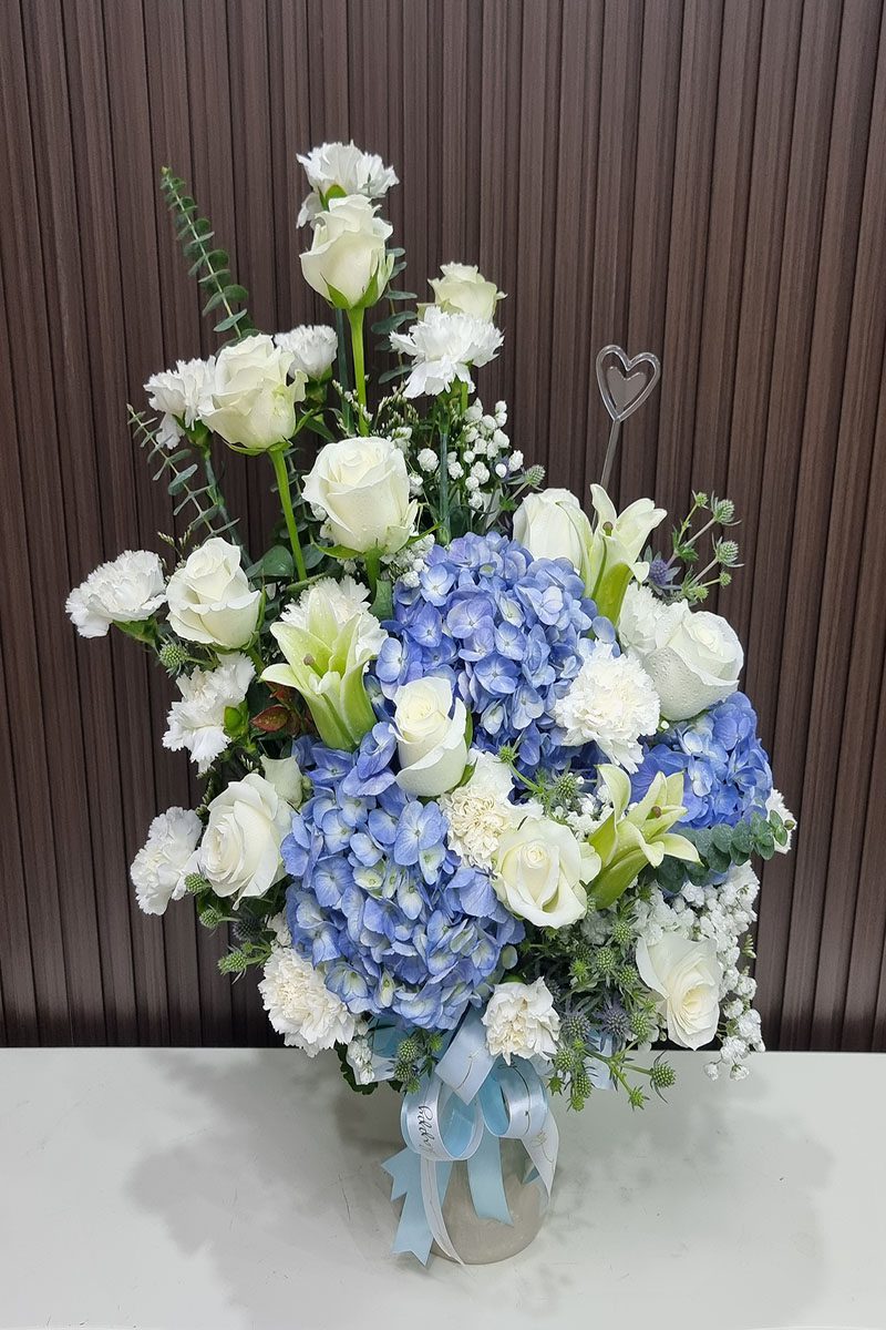 แจกันดอกไม้สดสีฟ้าขาว