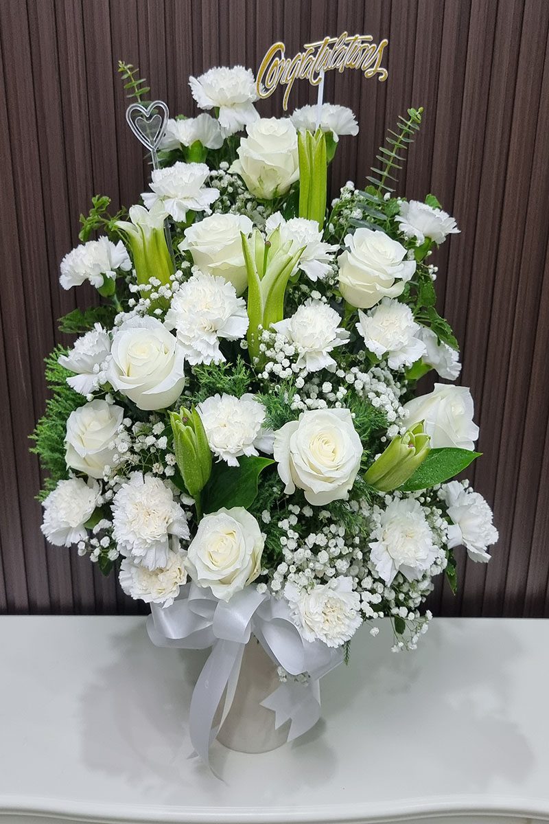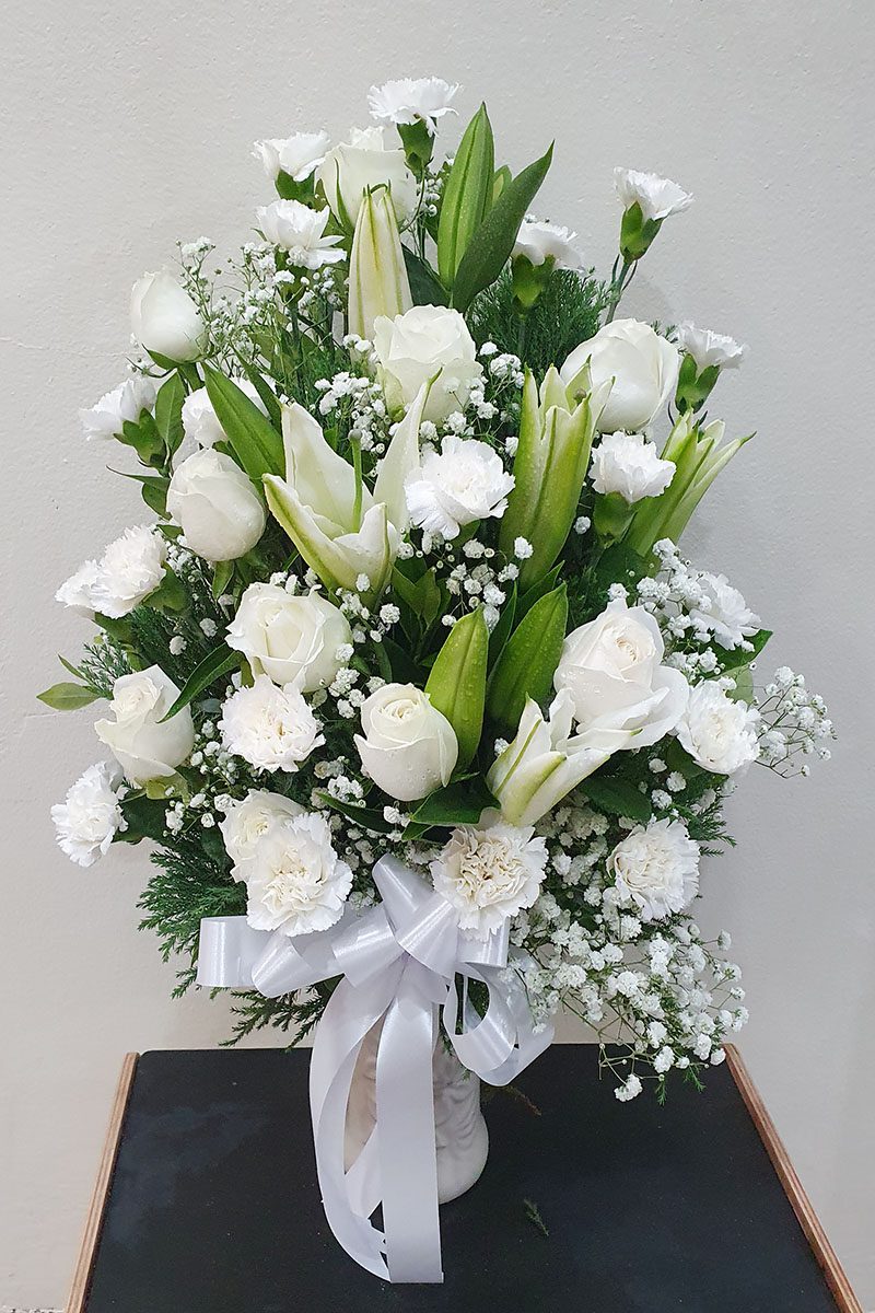 แจกันดอกไม้สด  สีขาว ประกอบไปด้วยดอกไม้ หลักคือ