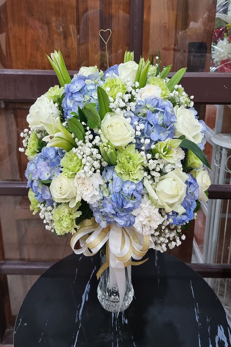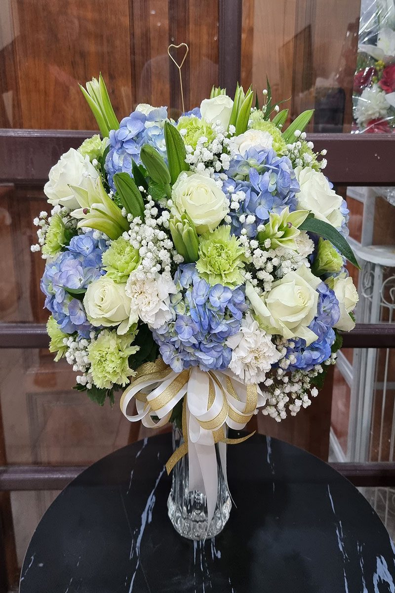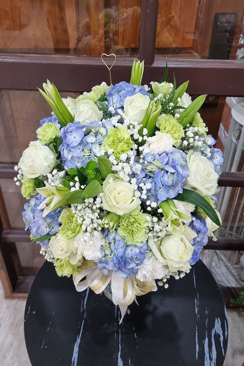 แจกันดอกไม้สด  สีขาว ฟ้าเขียว ประกอบไปด้วยดอกไม้ หลักคือ