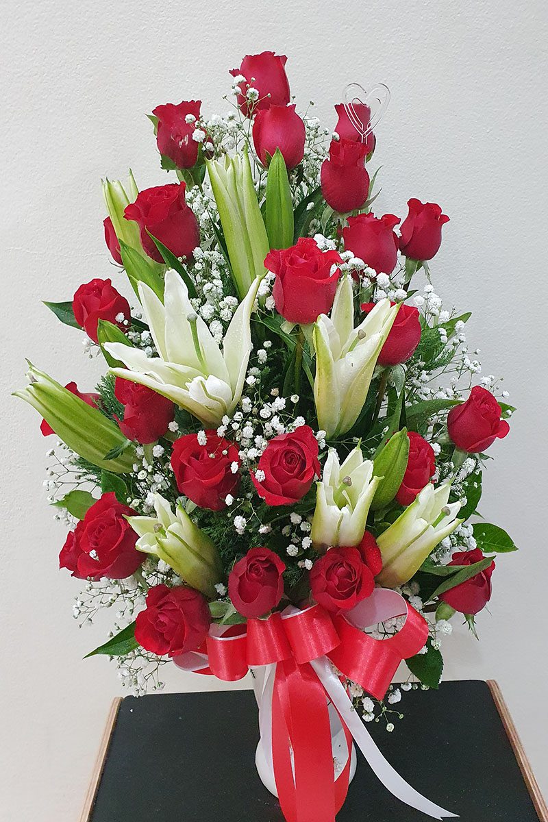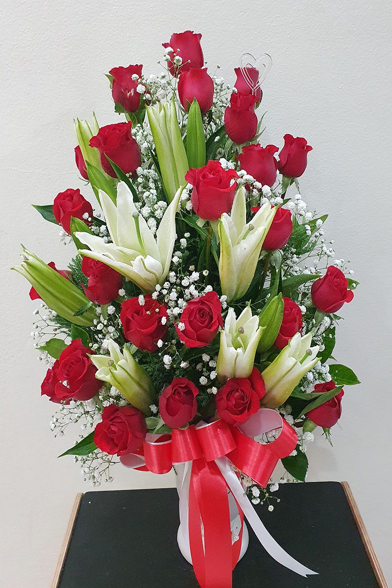 แจกันดอกไม้สด  สีแดง  ประกอบไปด้วยดอกไม้ หลักคือ