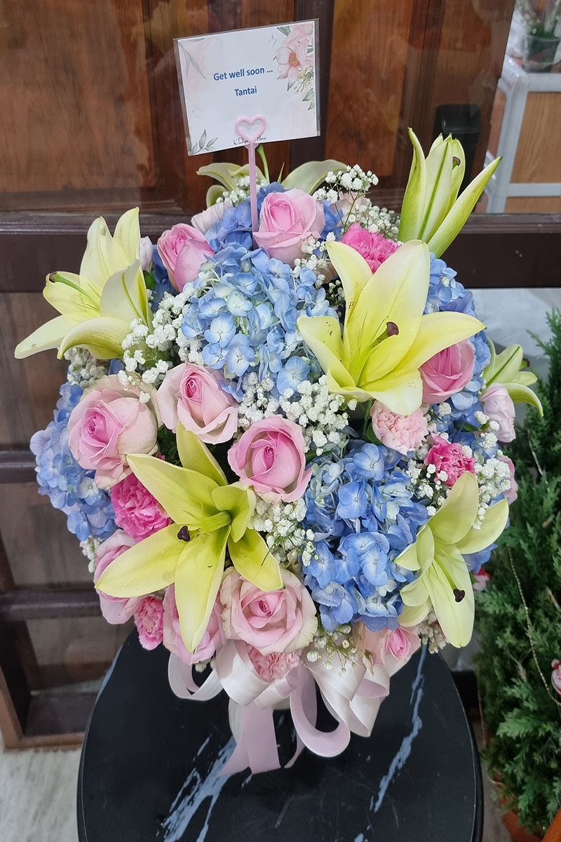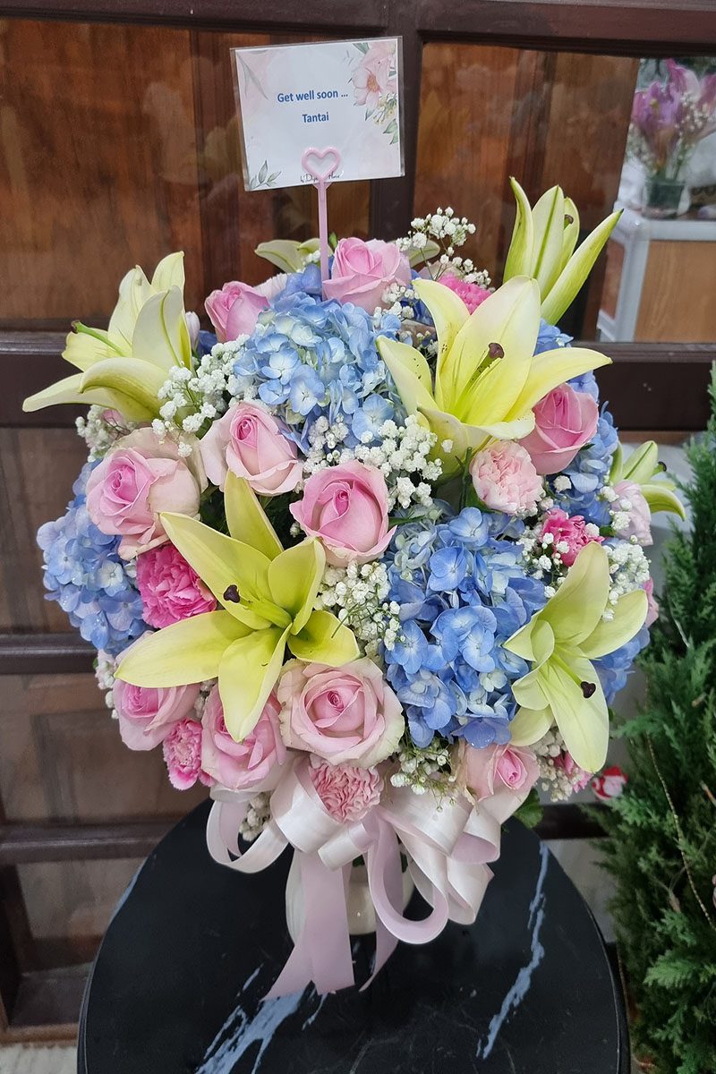 ดอกกุหลาบ ดอกคาเนชั่น ดอกไฮเดรนเยีย และดอกลิลลี่  แซมดอกยิปซี
