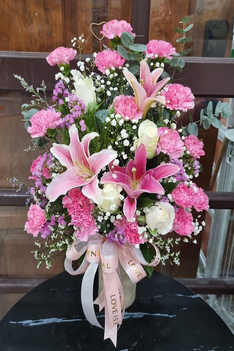 แจกันดอกไม้สด  สีชมพู ประกอบไปด้วยดอกไม้ หลักคือ