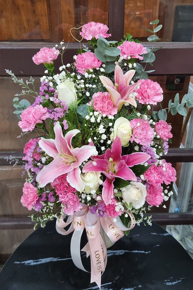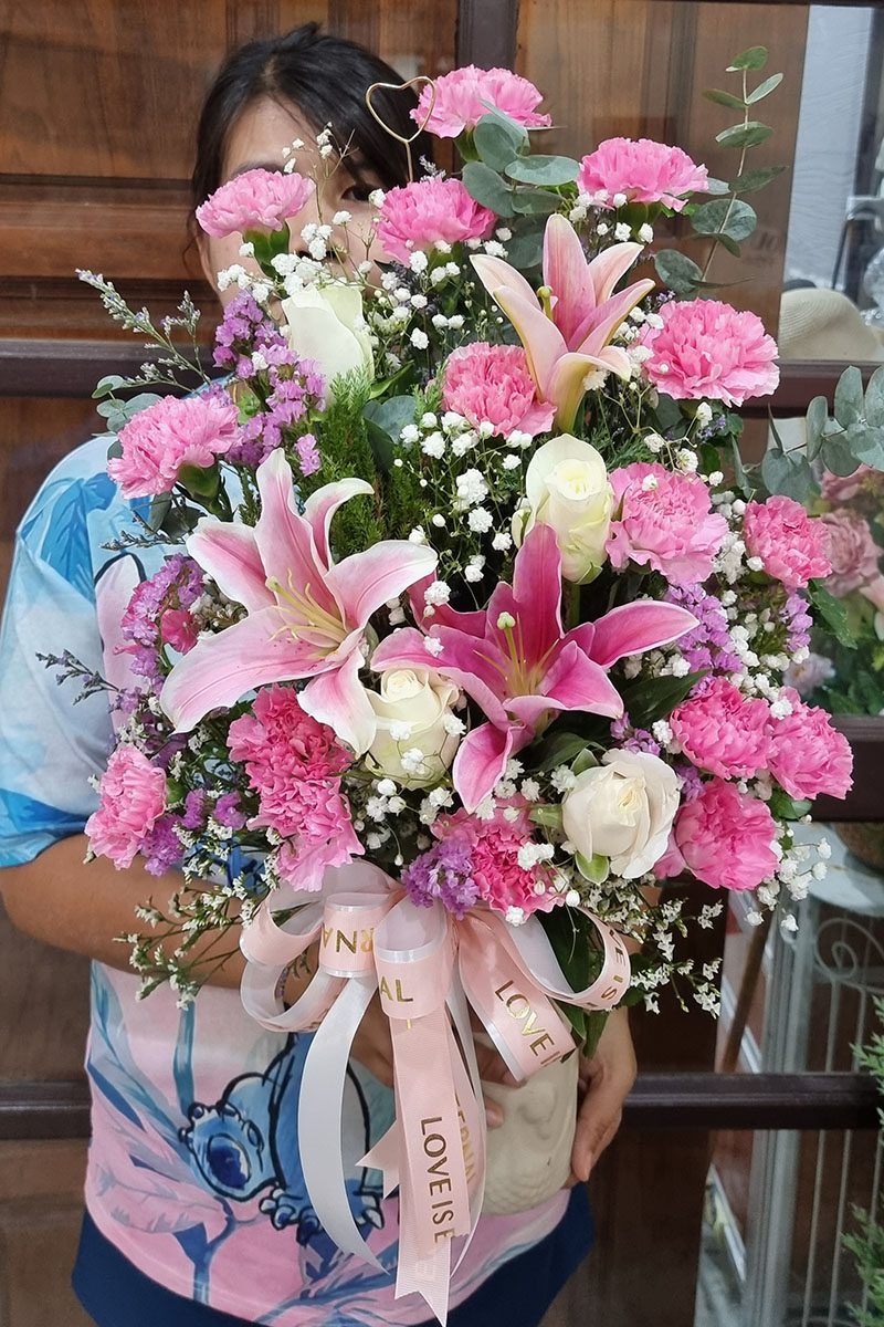 ดอกกุหลาบ ดอกคาเนชั่น และดอกลิลลี่  แซมดอกยิปซี
