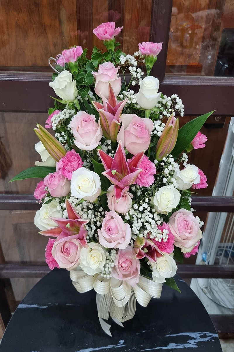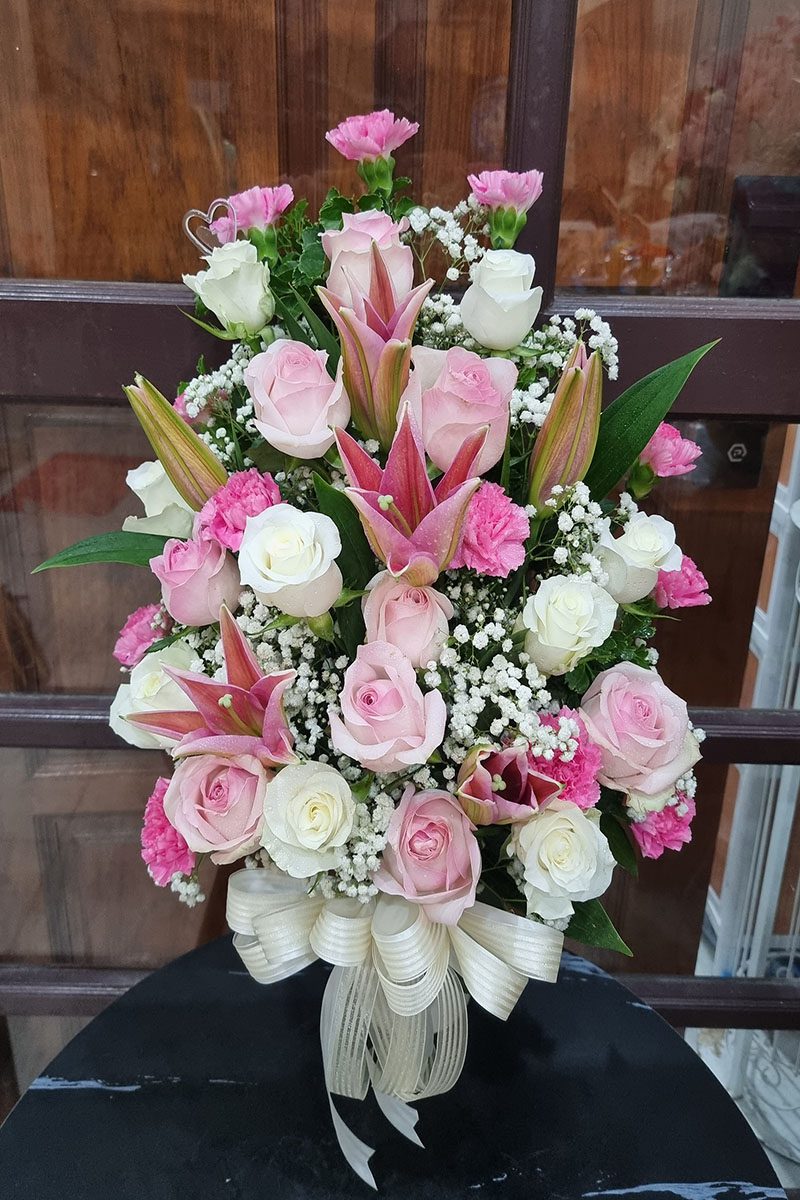 ดอกกุหลาบ ดอกคาเนชั่น และดอกลิลลี่  แซมดอกยิปซี