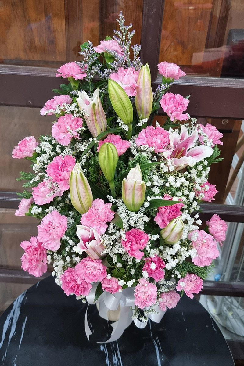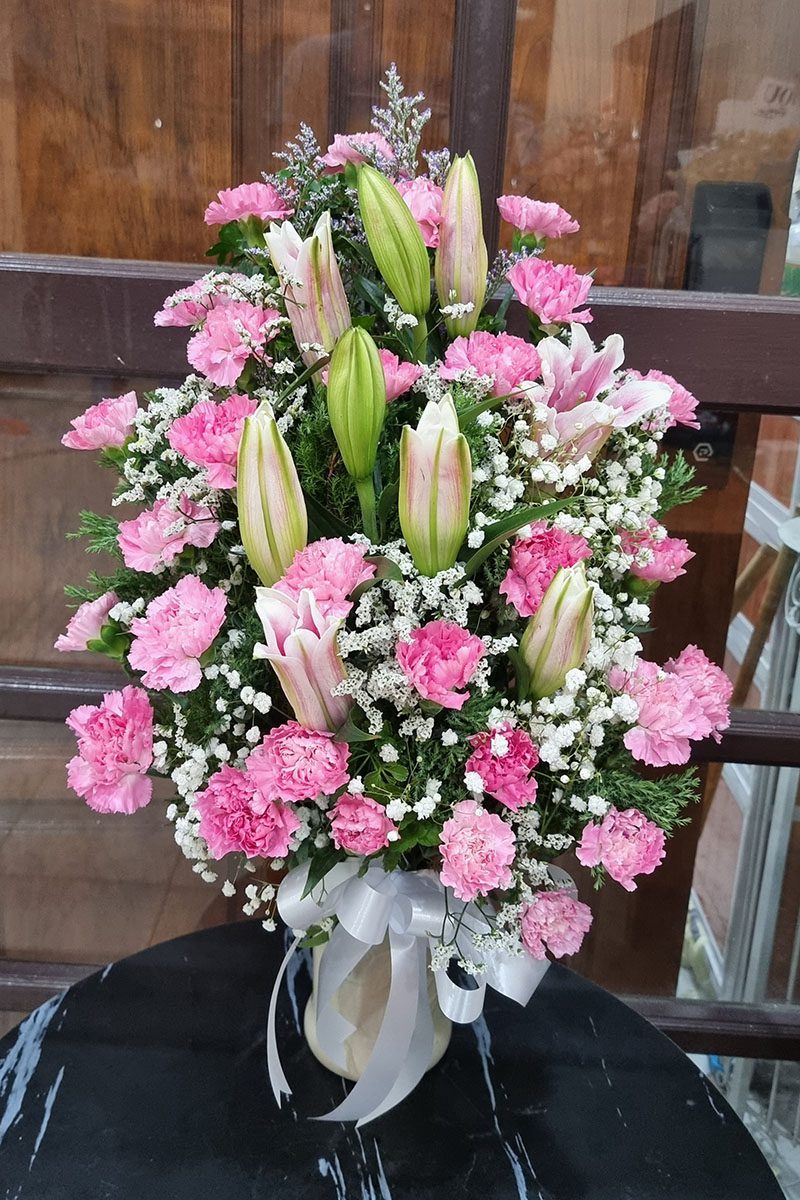 แจกันดอกไม้สด  สีชมพู ประกอบไปด้วยดอกไม้ หลักคือ