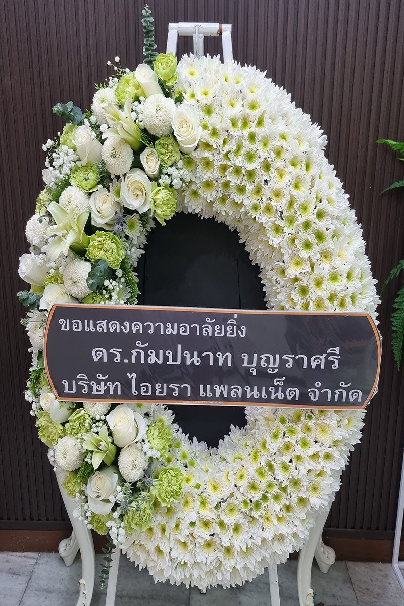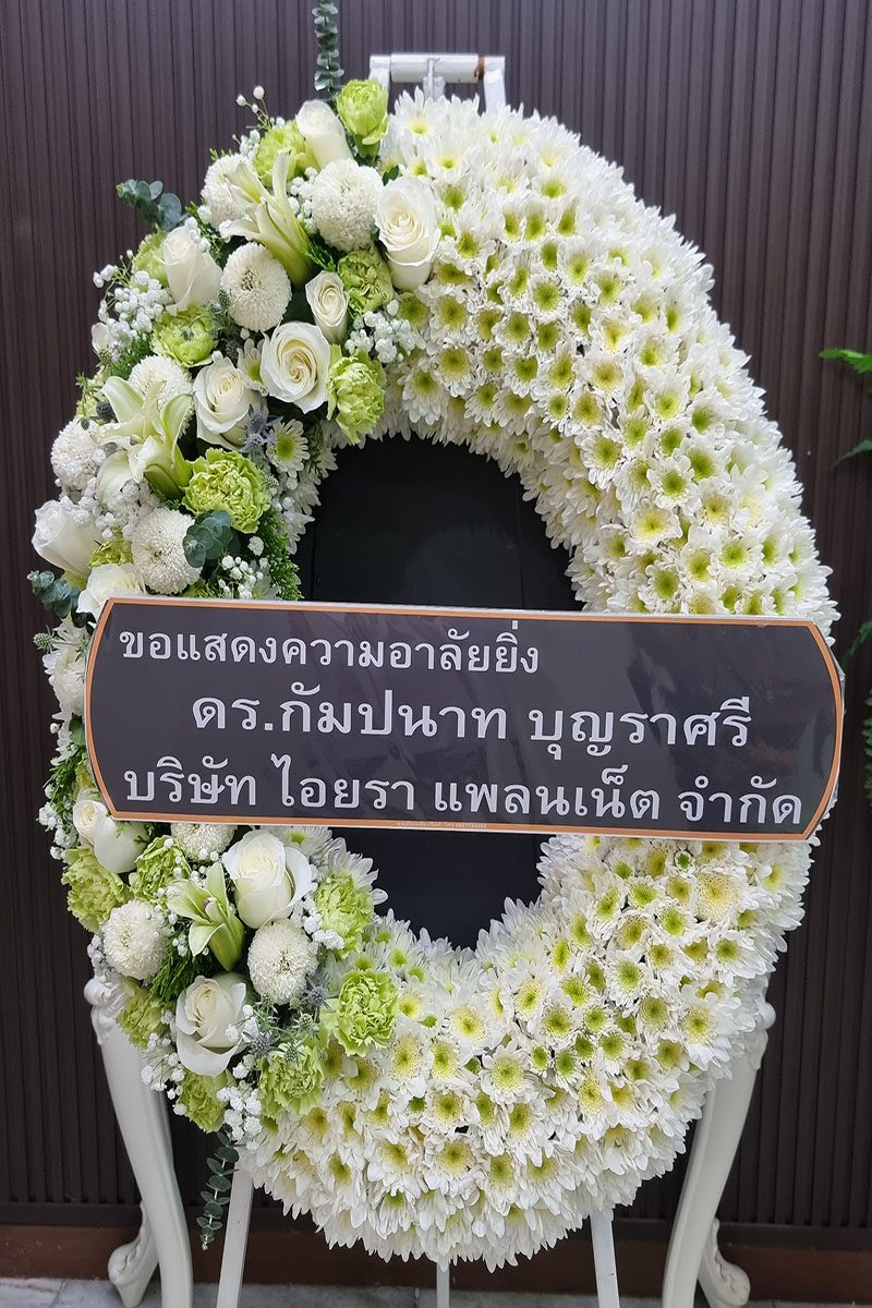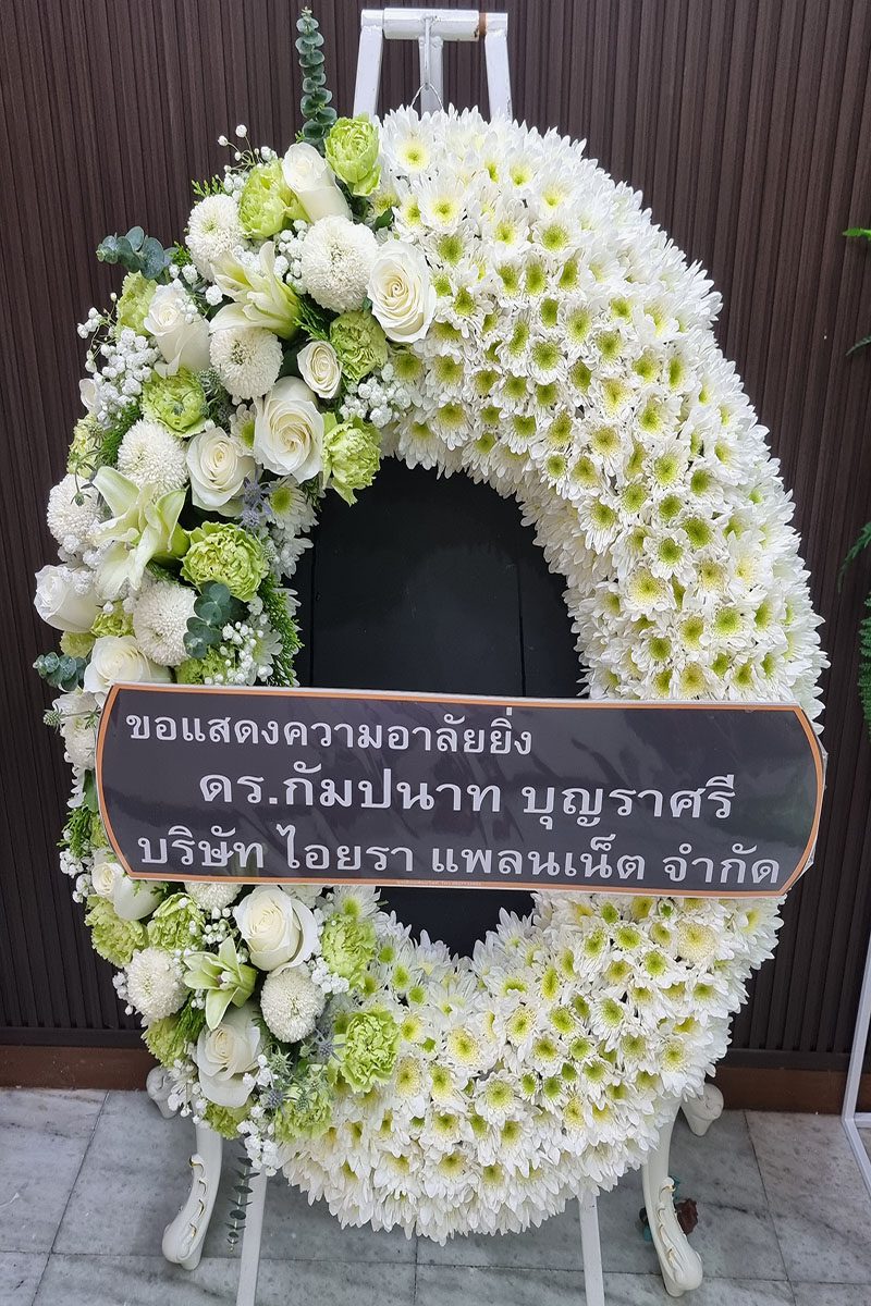 พวงหรีดดอกไม้แสดงความเสียใจ อาลัยต่อผู้ล่วงลับ: เป็นการแสดงความเคารพต่อผู้เสียชีวิต แสดงความร่วมรู้สึกต่อครอบครัวผู้สูญเสียมอบให้ในงานศพ พิธีฌาปนกิจ แทนความปรารถนาดีต่อผู้ล่วงลับ